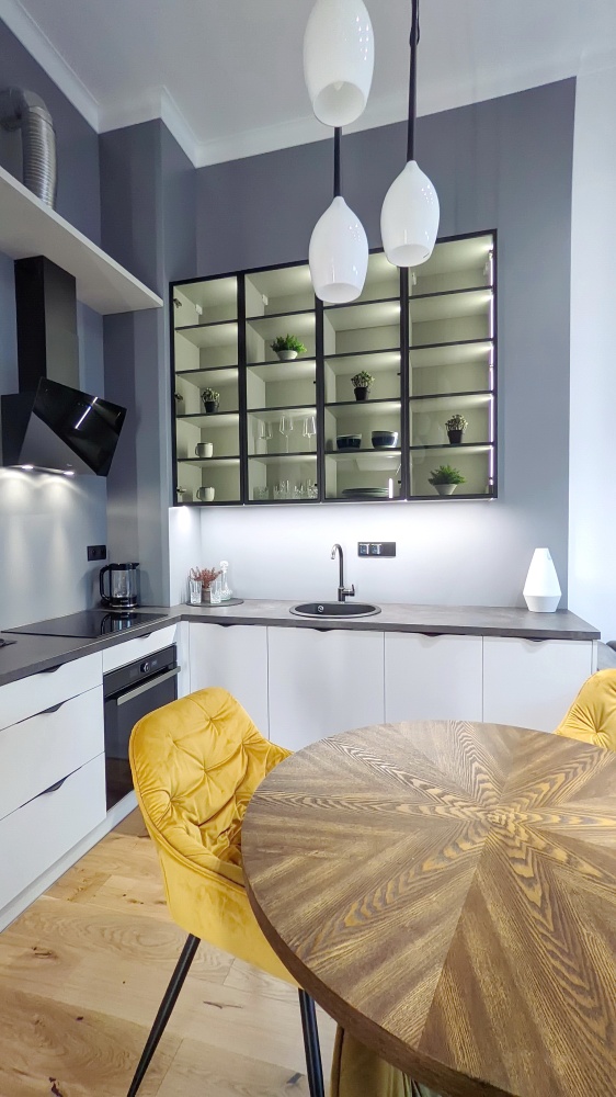 W salonie kuchenne szafki zostały wyposażone w oświetlenie, a dodatkowa podświetlenie obejmuje powierzchnię roboczą oraz okap. Nad stołem znajduje się duża lampa wisząca, a na suficie umieszczono białe reflektory, których jasność można regulować.