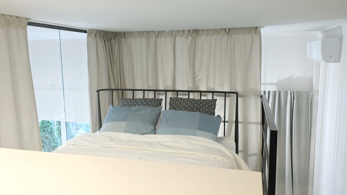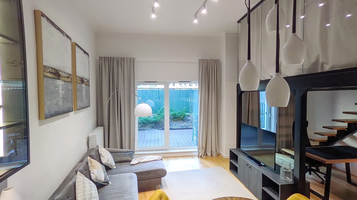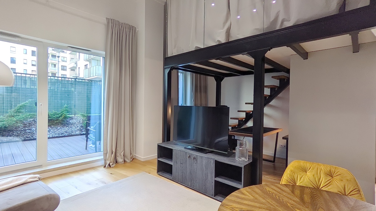Lokal został urządzony w nowoczesnym stylu. Ze względu na wysokość sufitu 3,8m powstała dodatkowa powierzchnia z antresolą 12 m2,( wysokość 168m) która stanowi dodatkową przestrzeń w postaci sypialni i garderoby. Antresola została częściowo przeszklona i wyposażona w zasłony, które zapewnią Ci więcej intymności.