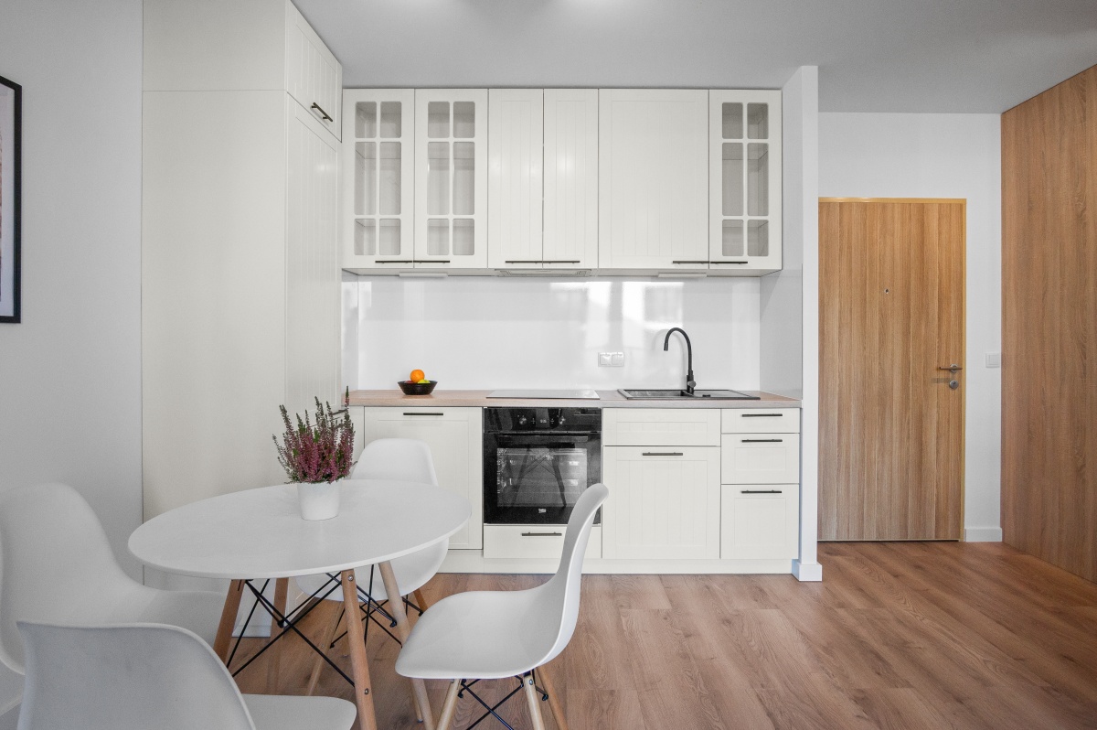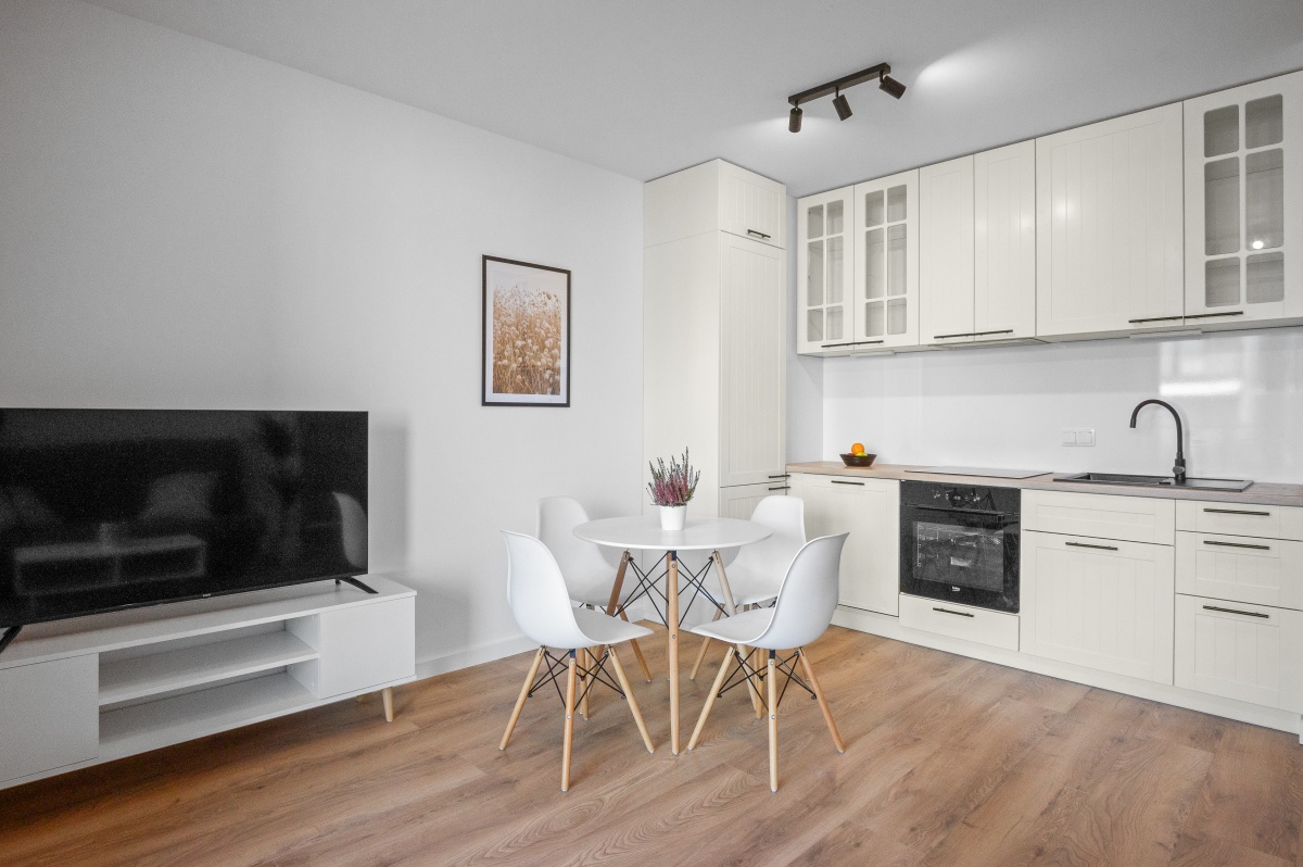 salon z aneksem kuchennym wyposażonym w płytę indukcyjną, piekarnik, zmywarkę i okap