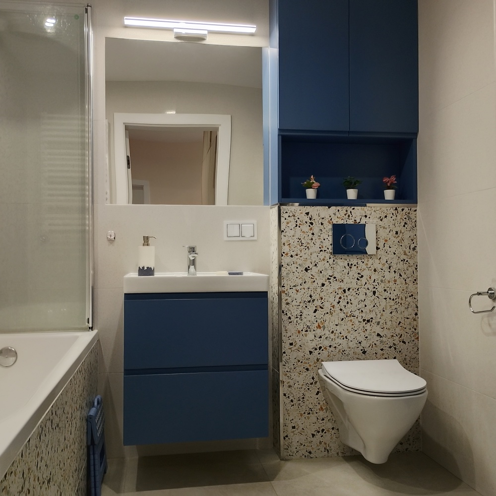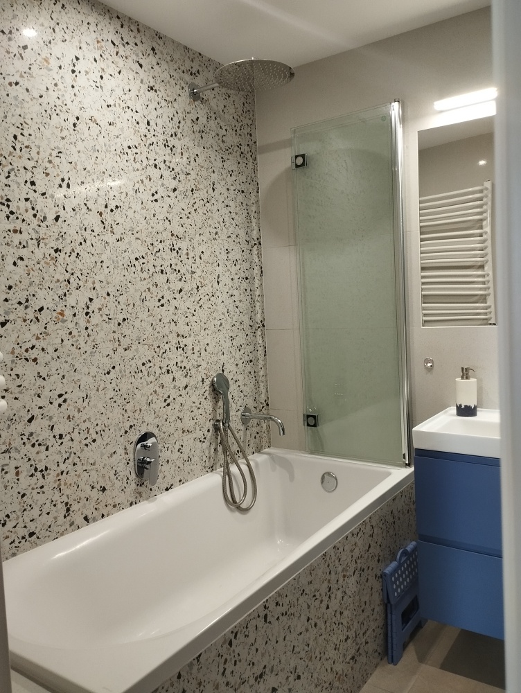 Łazienka: Duża, z wanną i składanym parawanem prysznicowym oraz zabudową meblową.
