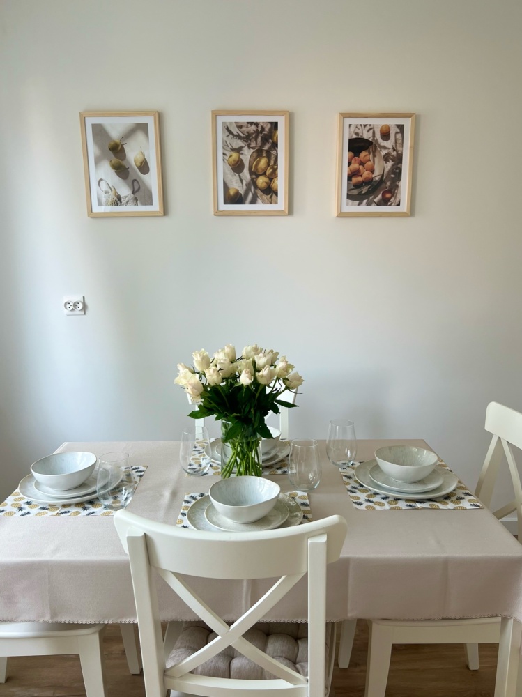 Kuchnia (~12m2): przestronna i nowoczesna kuchnia, w pełni wyposażona – nowy sprzęt AGD (lodówka, zmywarka, piekarnik, kuchenka) wraz z jadalnią (stół, 4 krzesła)
