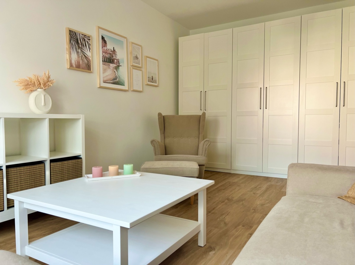 Salon (~18m2): wygodny narożnik (z funkcją spania), stolik, komoda, fotel z podnóżkiem, pojemne szafy