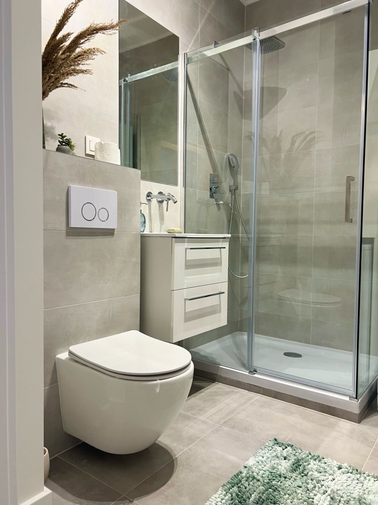 Łazienka (~4m2): prysznic, WC, umywalka z szafką, pralka, lustro, szafka