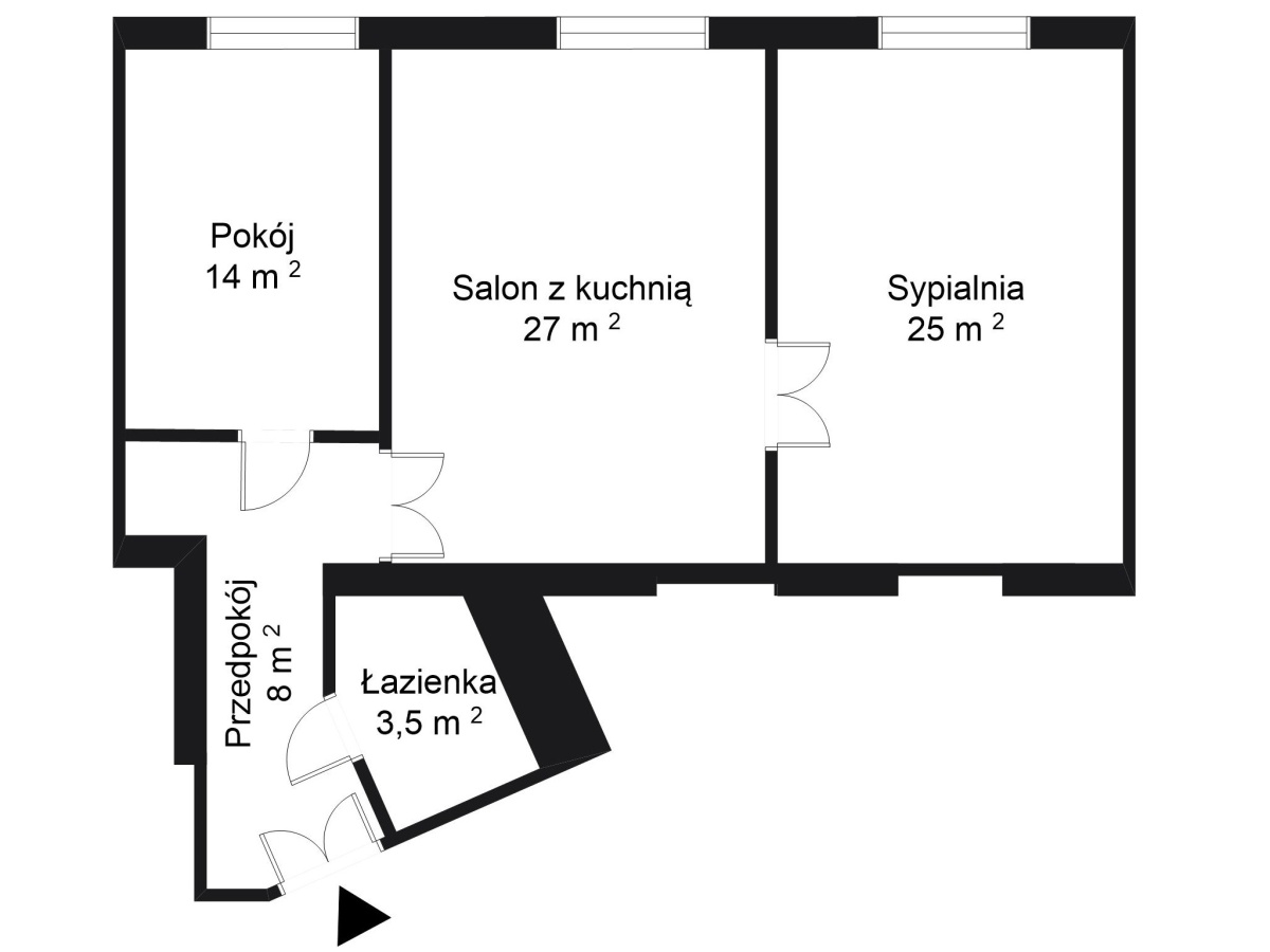 • salon z aneksem kuchennym (ok. 27 m²) z przejściem do dużej sypialni (istnieje możliwość wydzielenia osobnej kuchni i nieprzechodnich pokoi)