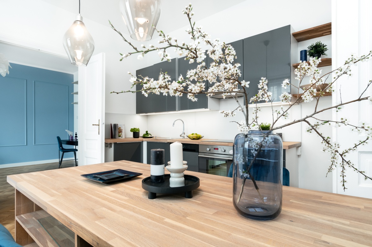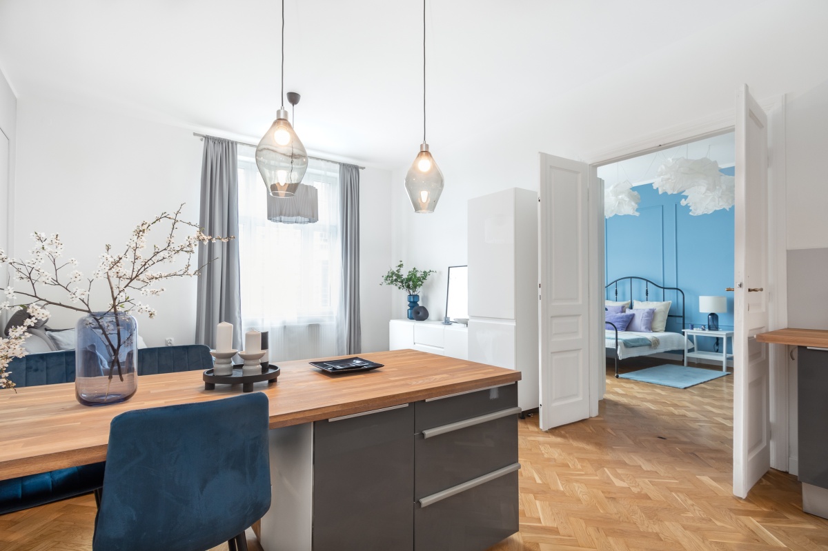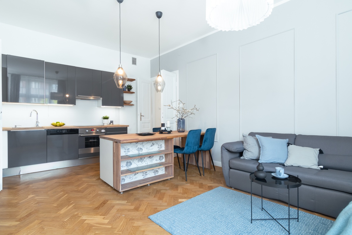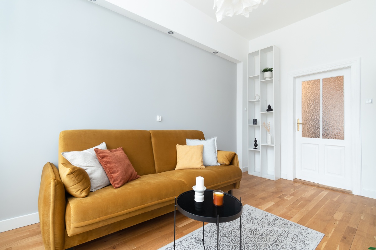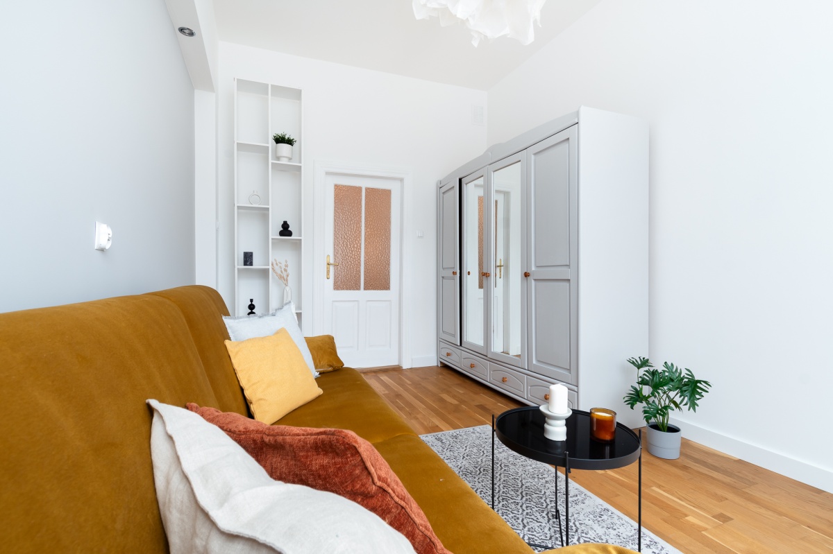 Wnętrze przestronne, jasne, pomieszczenia mają ok. 3 m wysokości. Zachowałam oryginalny dębowy parkiet, oraz drewniane, dwuskrzydłowe drzwi, które subtelnie nawiązują do charakteru krakowskich kamienic.