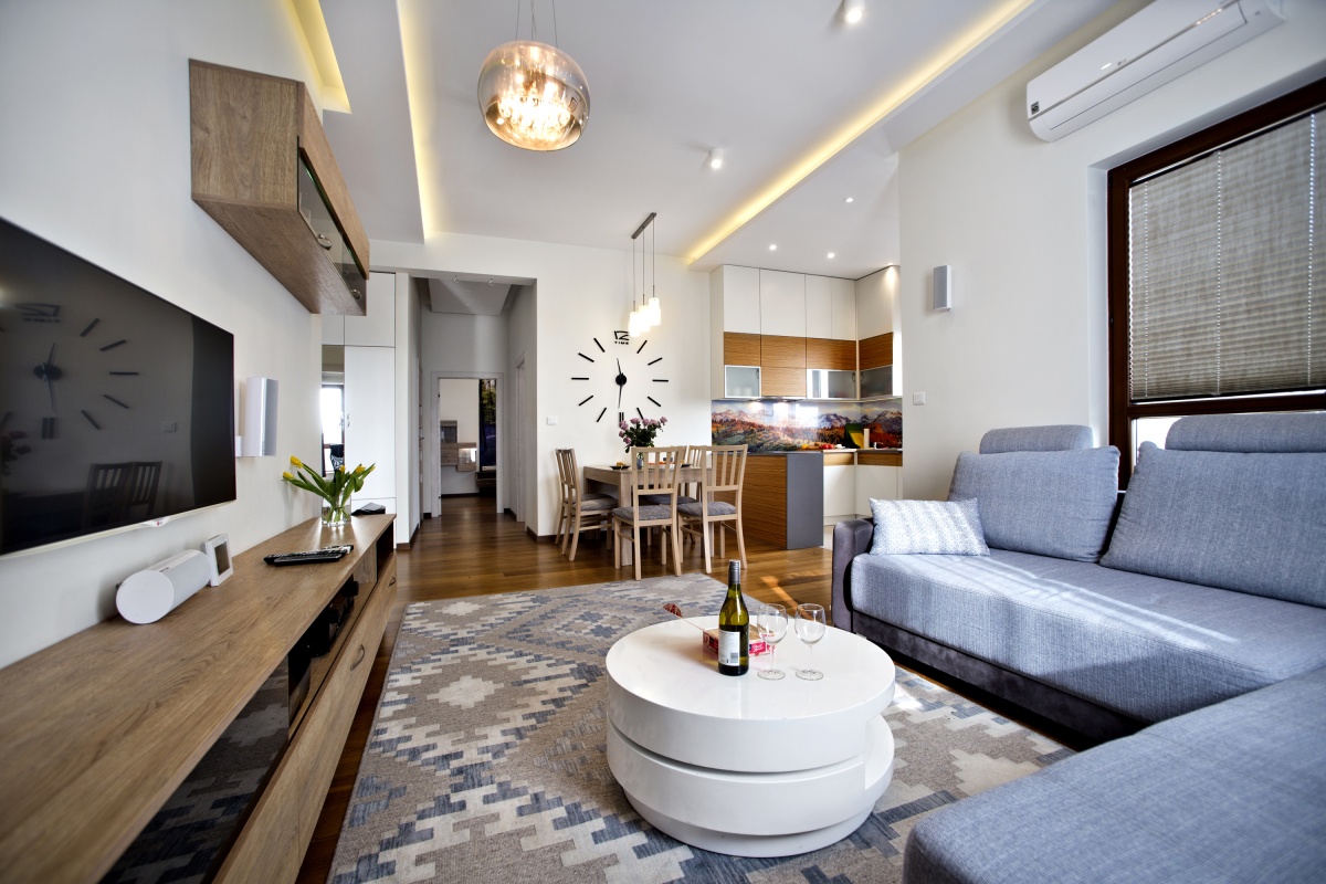 – duży, przeszklony salon z aneksem kuchennym, jadalnią, wyjściem na taras oraz klimatyzacją