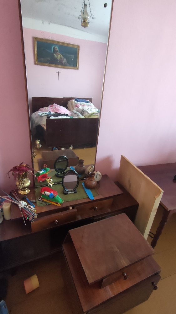 Jeśli ktoś by chciał sobie zatrzymać, są także w jednym z pokoi (różowe ściany) meble kalwaryjskie – witrynka, lustro z szafką, dwie nocne szafki.