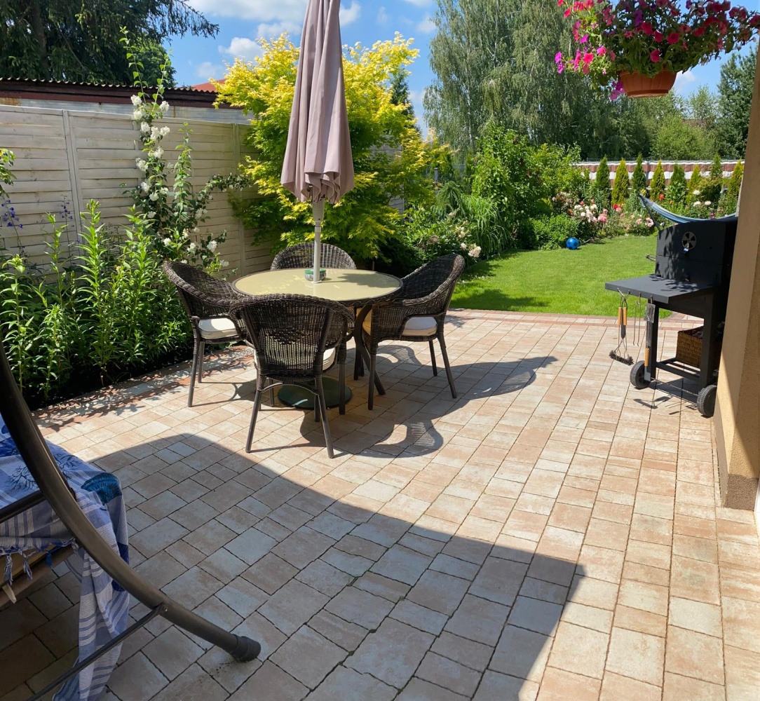 Posesja jest ogrodzona (brak jedynie bramy-wszystkie instalacje podprowadzone) i posiada podjazd na conajmniej trzy samochody. Niewątpliwym walorem jest piękny i zadbany ogród który jest oczkiem w głowie Pani domu. Znajdziemy tam piękne róże, kwitnące krzewy, drzewka owocowe oraz inne rośliny i kwiaty na rabatach. Taras usytuowany z tyłu domu pośród drzew co daje poczucie prywatności i spokoju. Osobno niewielka drewutnia. Garaż w bryle budynku z napięciem 440V oraz woda i prąd wyprowadzona na zewnątrz budynku do ogrodu. W ogrodzie znajduje się również rozprowadzona instalacja pod oświetlenie ogrodowe włączane z domu oraz podziemny zbiornik na deszczówkę (2000l)z pompą – przydatna do podlewania ogrodu. Monitoring posesji z poziomu aplikacji na urządzeniu mobilnym.