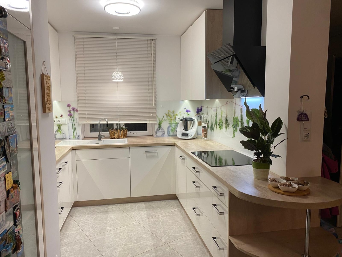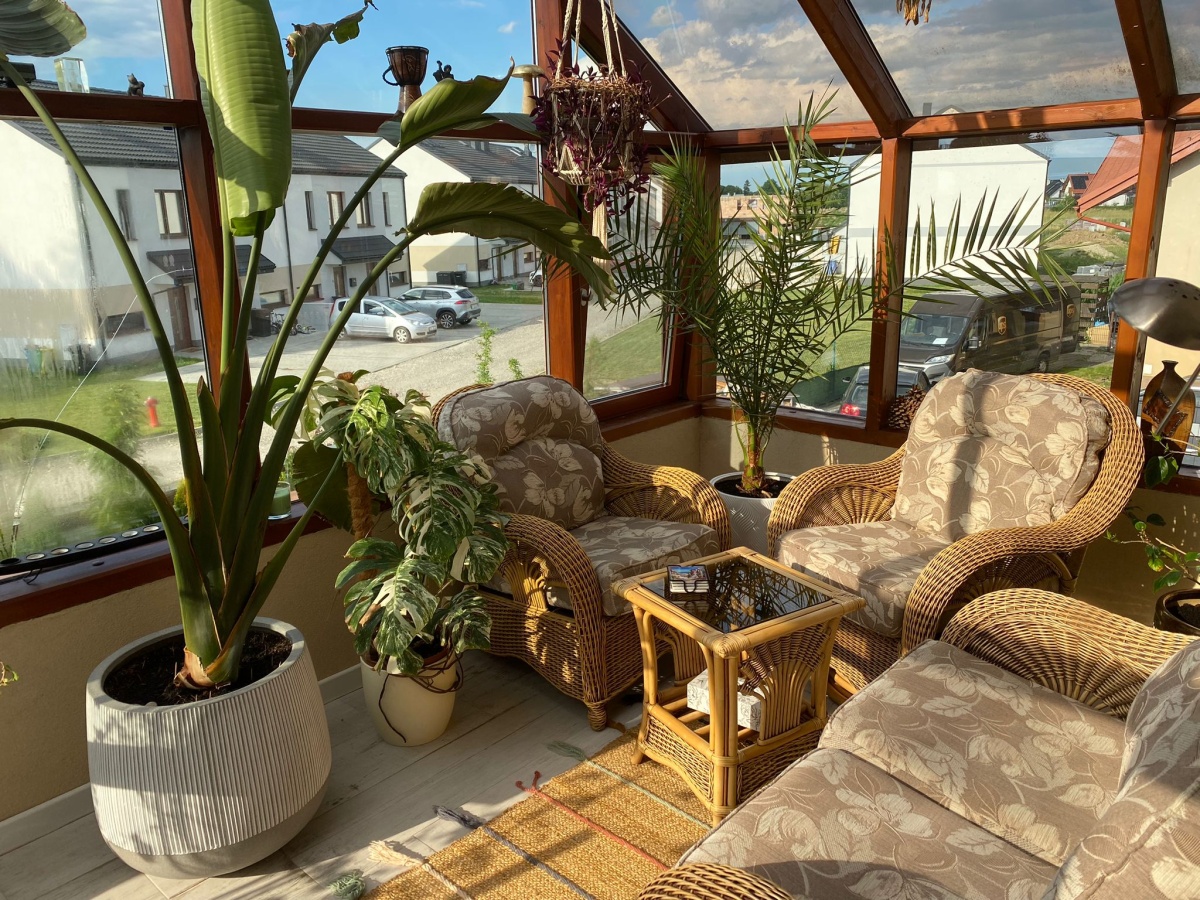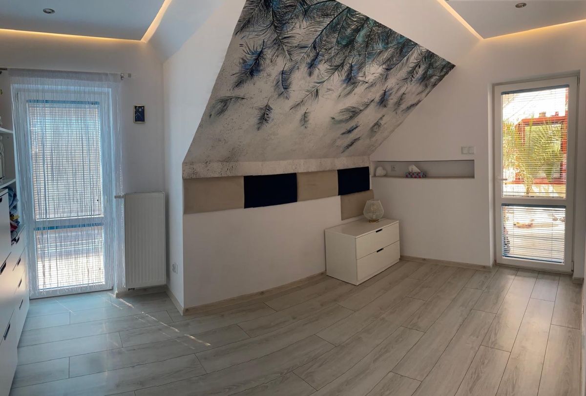 Na parterze znajduje się przestronny salon z kominkiem, połączony z nowoczesną kuchnią. Znajduje się tu też niewielki przedpokój oraz toaleta i pomieszczenie gospodarcze, które dodatkowo zaadoptowano na pralnie. Na piętrze trzy sypialnie w tym jedna z wydzieloną garderobą oraz jedna z zabudowanymi szafkami w skosie. Podwieszane sufity z dodatkowym oświetleniem LED w pokojach, salonie, łazience, toalecie oraz w przedpokoju. Dodatkowo ogromnym atutem jest ogród zimowy który tworzy niepowtarzalny klimat zarówno zimą jak i latem. Istnieje możliwość zaadoptowania tego pomieszczenia na dodatkową sypialnię bez dodatkowych pozwoleń i ingerencji w strukturę budynku. Poddasze(strych)nieużytkowe, ocieplone i wykończone płytami OSB(służy jako dodatkowa przestrzeń magazynowa).