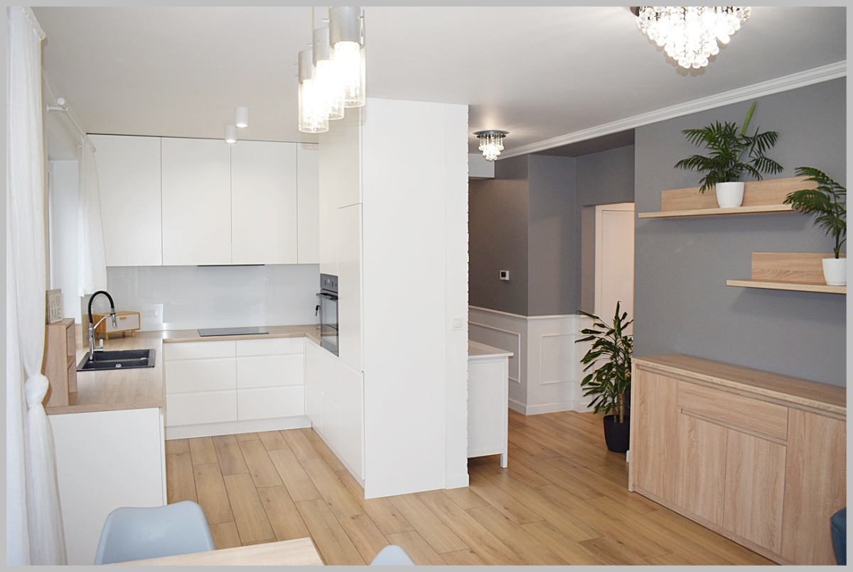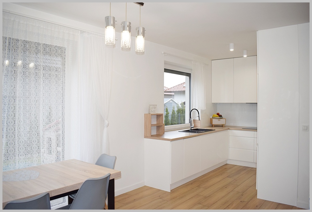 Kuchnia zabudowana wraz ze sprzętem AGD: piekarnik elektryczny, płyta grzewcza indukcyjna- ELECTROLUX, lodówko-zamrażarka – SAMSUNG, zmywarka- SIEMENS, okap.