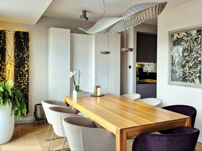 Dom wyróżnia się wysoką jakością wykończenia i nowoczesnym designem. W 2025 roku odświeżono wnętrza – pomalowany parter, piętro oraz klatka schodowa. W całym domu działa bezprzewodowy internet Wi-Fi oparty na architekturze UniFi (5 punktów dostępu Ubiquiti U7 PRO), a monitoring zarówno zewnętrzny jak i wewnątrz zapewnia bezpieczeństwo domowników.