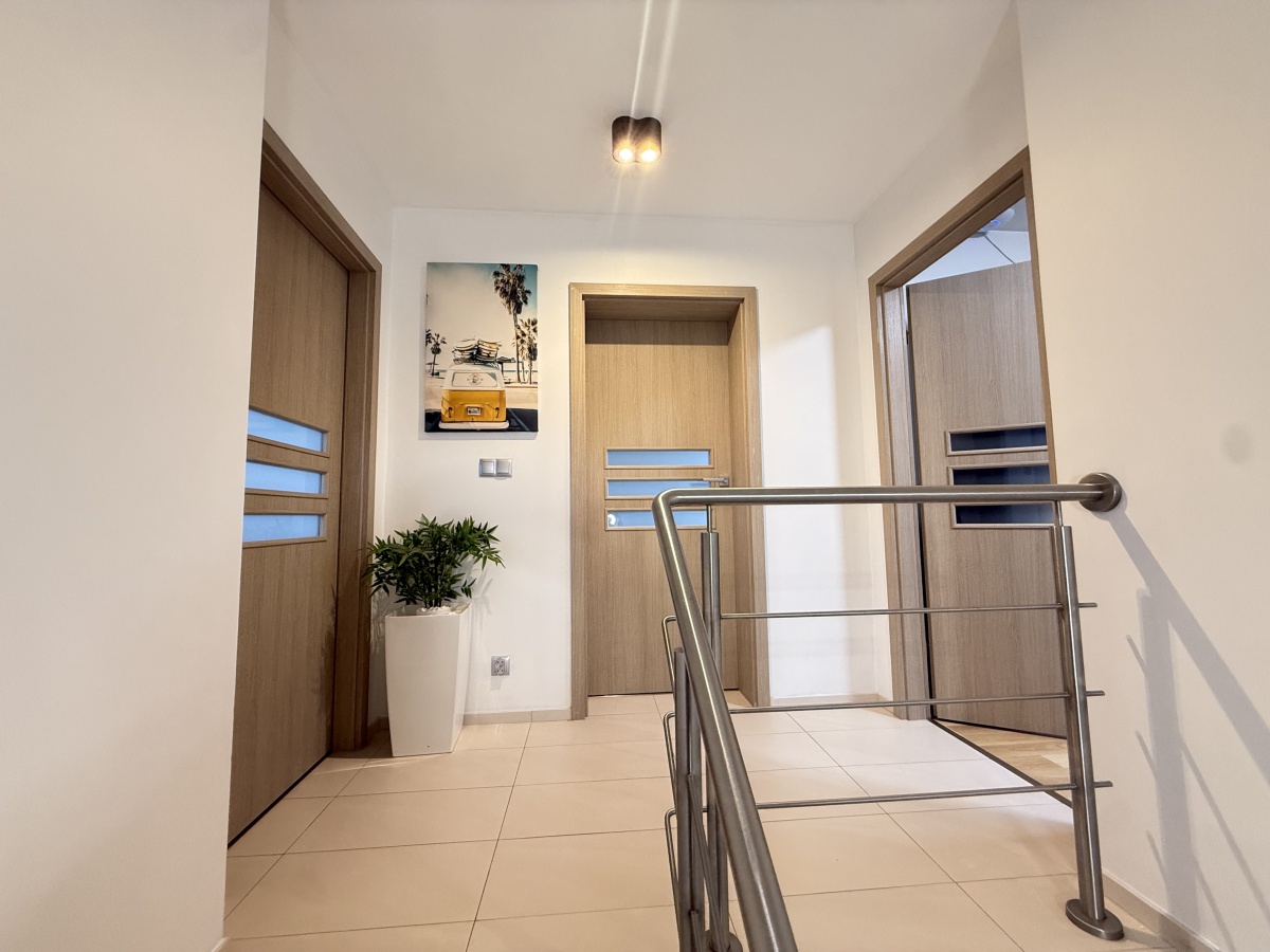 Piętro (70,29 m²): trzy sypialnie (w tym główna 17,77 m²) oraz komfortowa łazienka (14,5 m²). W sypialni oraz w jednym z pokoi klimatyzacja. W każdym z pokoju zabudowana szafa.