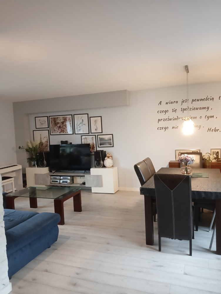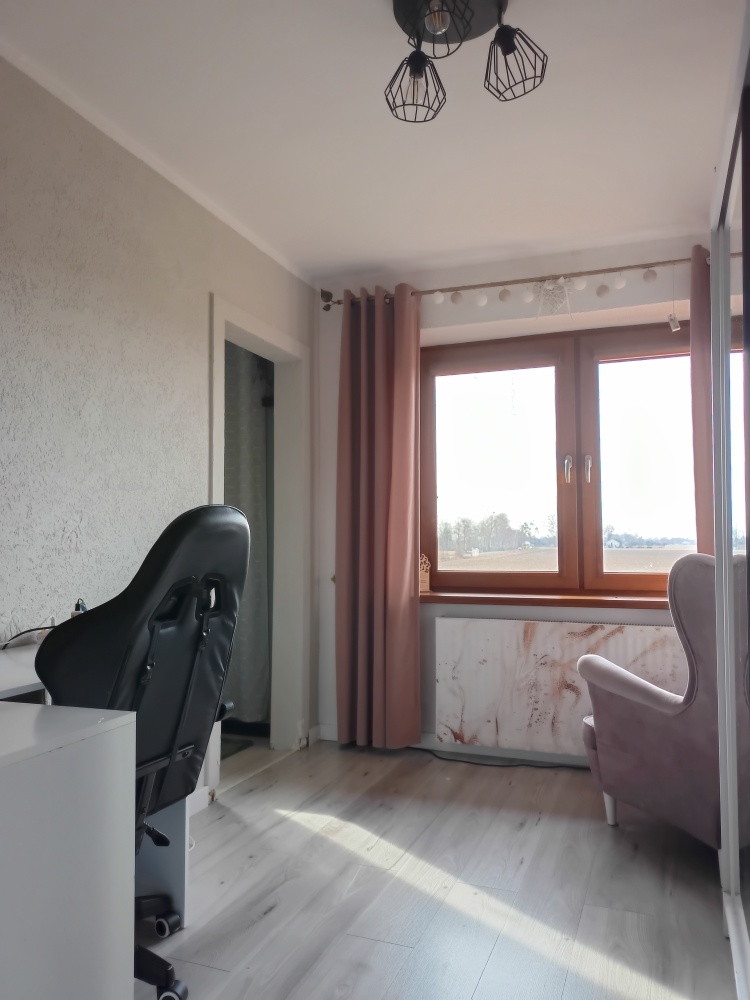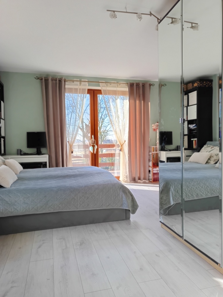przestronny salon z otwartą kuchnią, przedpokój, łazienka z prysznicem, dwie duże sypialnie .