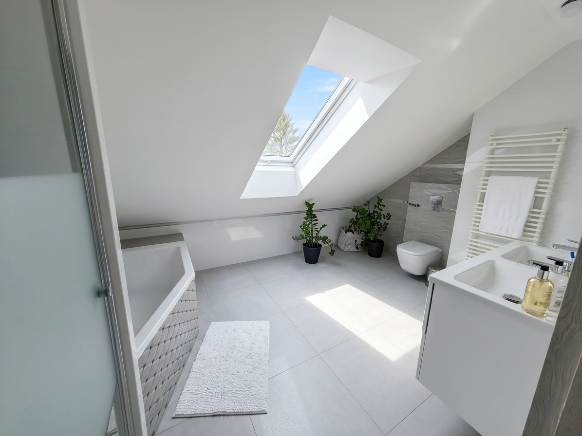 Piętro to prywatna strefa domowników, oferująca trzy duże, komfortowe sypialnie i przestronną łazienkę z wanną i prysznicem oraz dwiema umywalkami. Każda z sypialni posiada własną garderobę, co jest ogromnym atutem i zapewnia doskonałą organizację. W łazience na piętrze również jest ogrzewanie podłogowe, a w pozostałych pomieszczeniach kaloryfery. Na podłodze po całości panele.