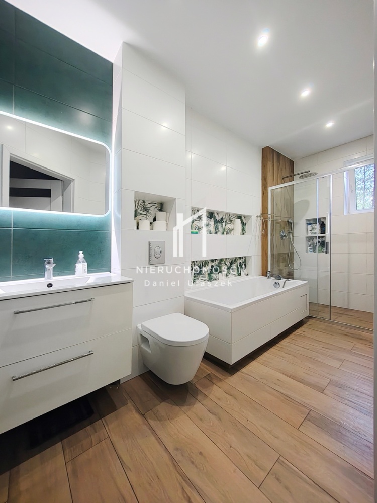 – komfortowa łazienka o powierzchni 8,72m2 wykończona w jasnych barwach z akcentem zielonego dekoru, doskonale zaaranżowana z miejscem na wannę, prysznic, WC i umywalkę,