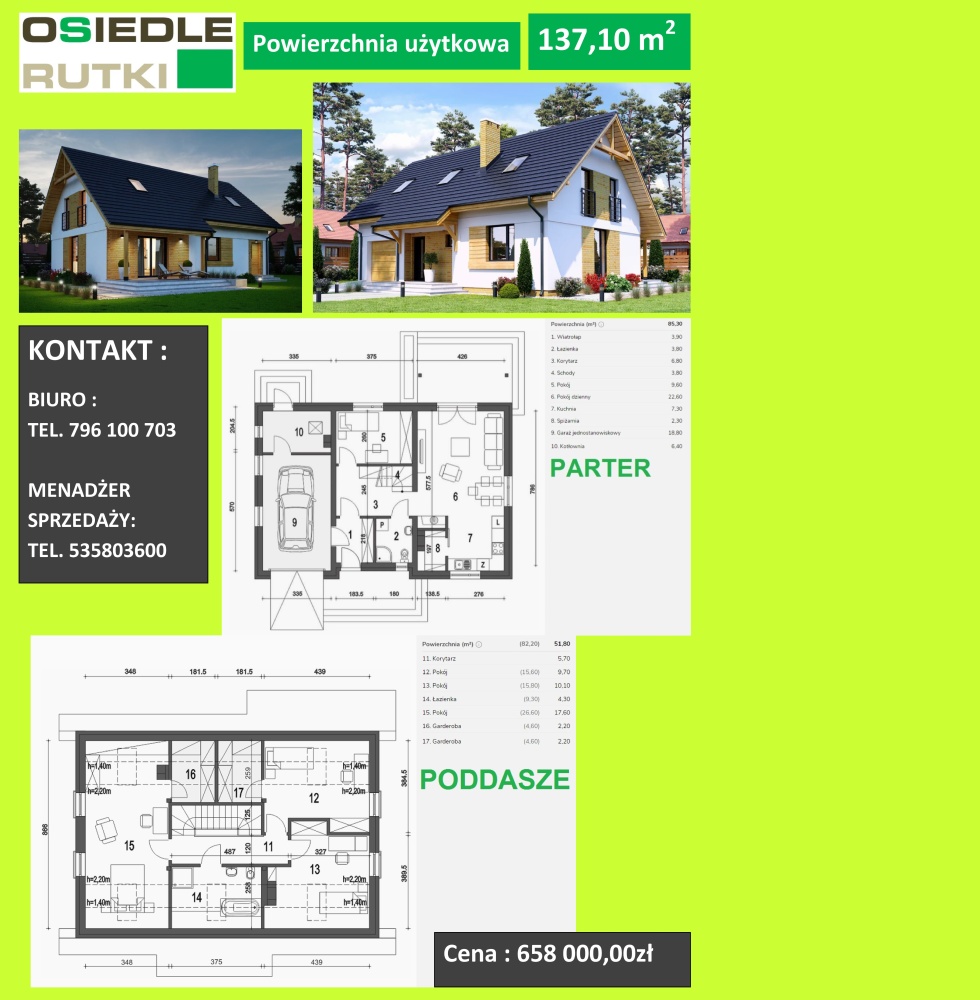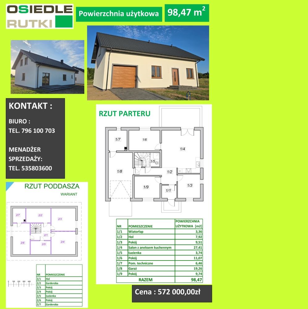 Dom z poddaszem z możliwością jego wykorzystania na użytkowe, rozkład pomieszczeń w poszczególnych budynkach zgodnie z załączonymi metryczkami budynków.