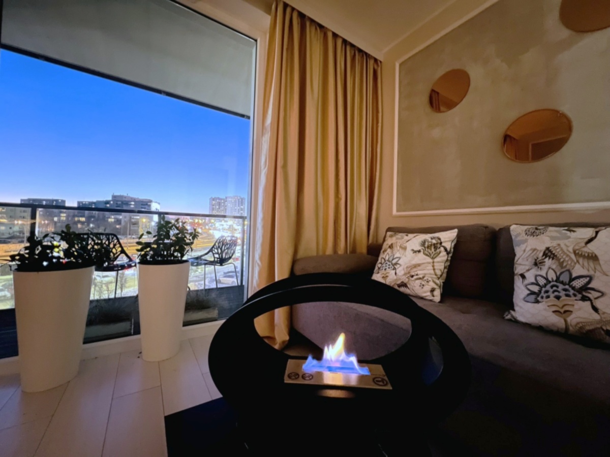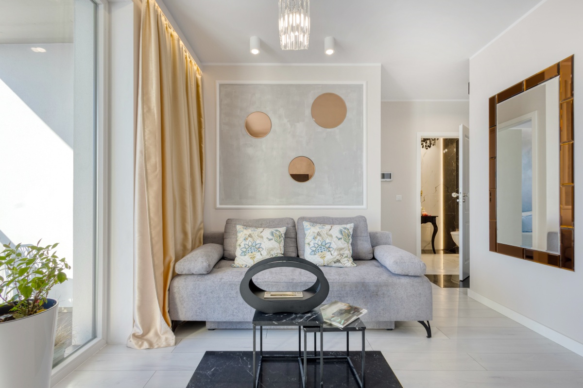 Zainstalowane w salonie oświetlenie, zaprojektowane z wykorzystaniem kryształowych lamp i ledów, wyczarowuje cudowną atmosferę. Centralnym punkt pomieszczenia jest stylowy biały stół, otoczony wygodnymi fotelami. Nad stołem góruje mozaika zaprojektowana z fazowanych luster, w której odbijają się światła kryształowych lamp. Niewątpliwym atutem salonu jest część wypoczynkowa z wygodną, rozkładaną kanapą, zapraszającą do relaksu. Przez duże panoramiczne okno roztacza się z niej rozległy widok na panoramę Moreny.