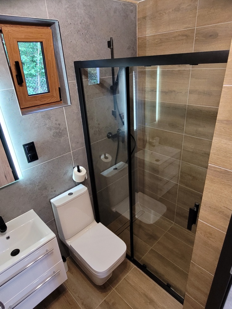 Po jednej stronie stawu znajduje się opisany wyżej dom mieszkalny wraz z garażami, a po drugiej stronie stoją dwa domki caloroczne o powierzchni zabudowy 35m² każdy, obydwa wybudowane w 2023. Powierzchnia po podłodze każdego domku wynosi ok 40m². Są to dwa identyczne domki, murowane i ocieplone z antresolą, wykończone w wysokim standardzie. Kazdy z domków: salon z aneksem kuchennym, łazienka, sypialnia + druga sypialnia na antresoli.