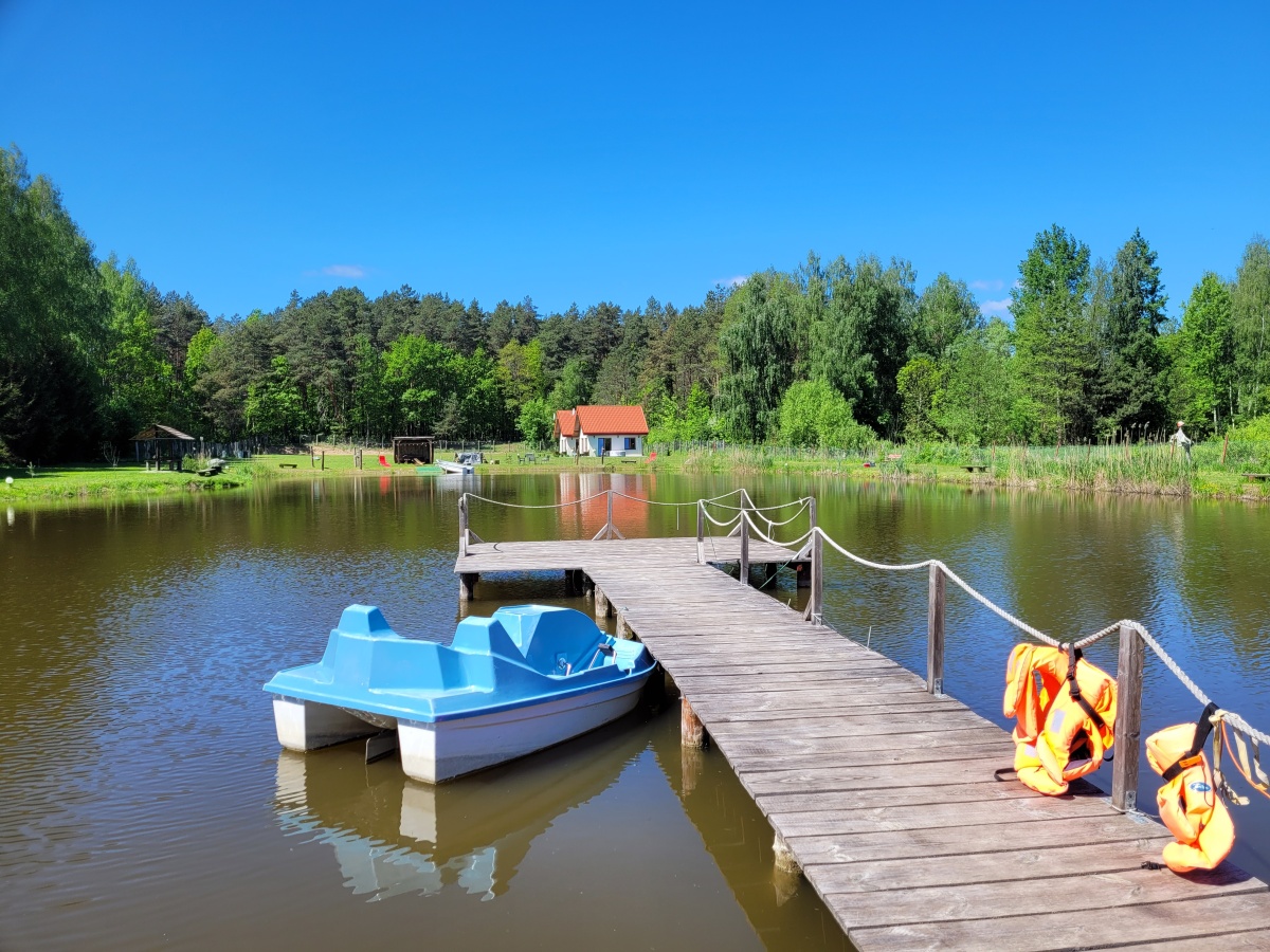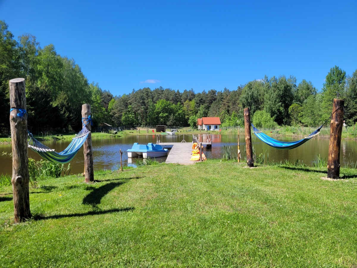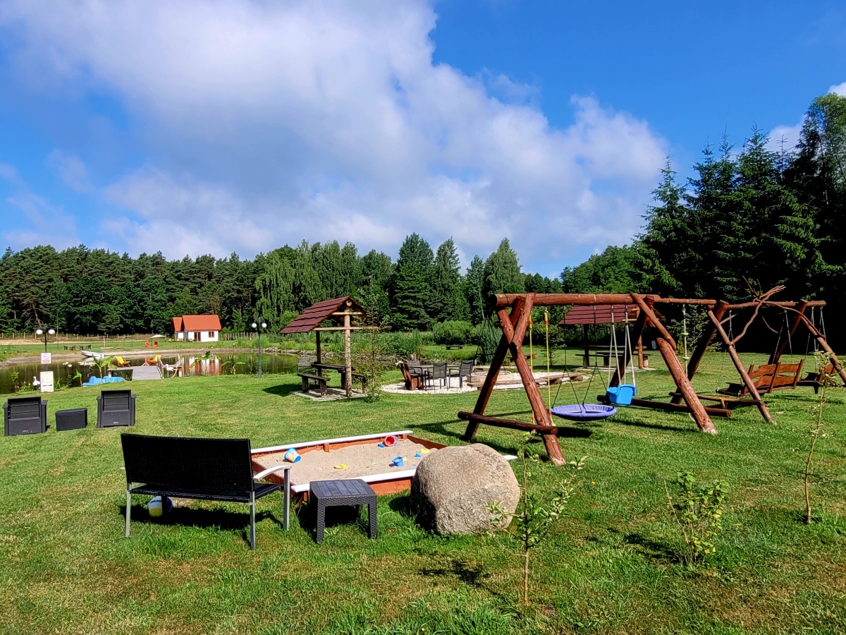 Na działce znajduje się mały plac zabaw, parę hamaków, są 2 miejsca na ognisko, a na stawie znajduje się pomost, z którego można łowić ryby i to bez żadnych ograniczeń i pozwoleń:). Dodatkowo na działce namiot 6m x 12m z ping-pongiem, minibilardem i pilkarzykami. We wrześniu 2025 zakupiona balia na drewno z hydromasażem. Działka jest ogrodzona, a wzdłuż płotu rosną częściowo duże świerki oraz kilka mniejszych świerków, tuj i innych drzewek również owocowych i krzaków zasadzonych w ostatnich latach.