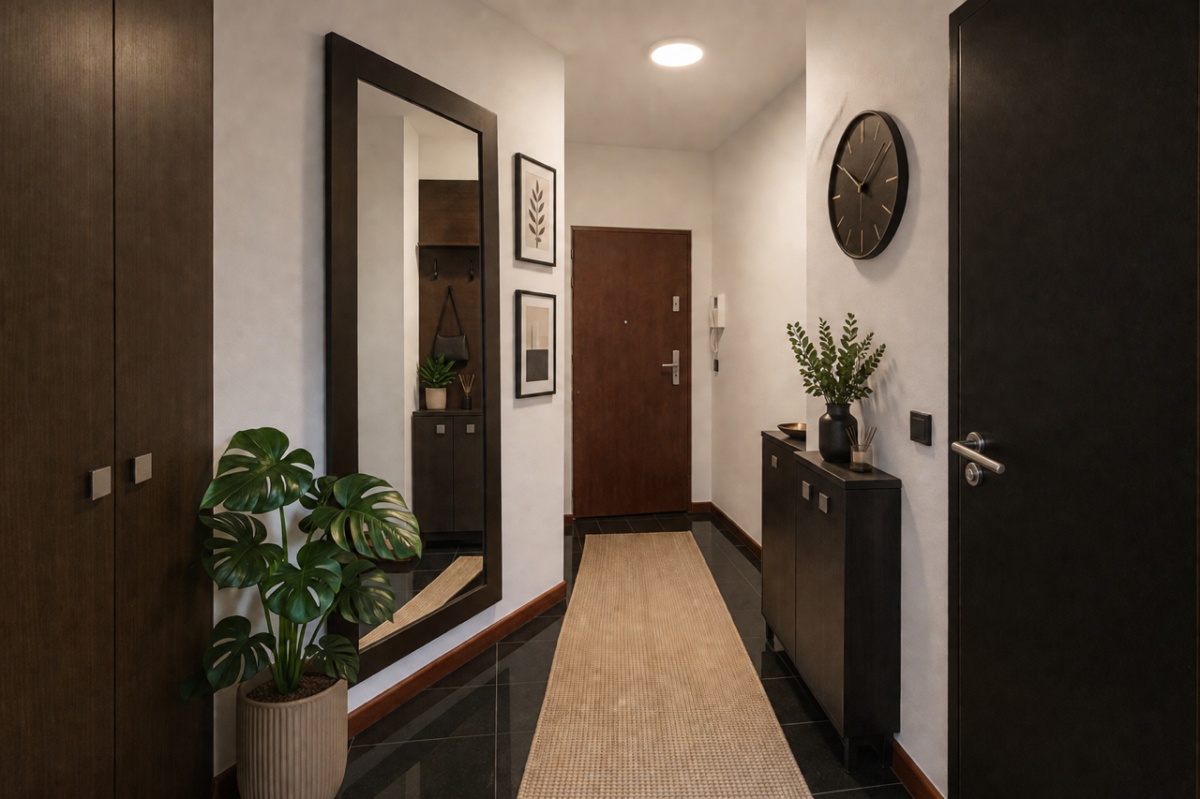 W przestronnym korytarzu znajduje się duża szafa i szafka na buty.