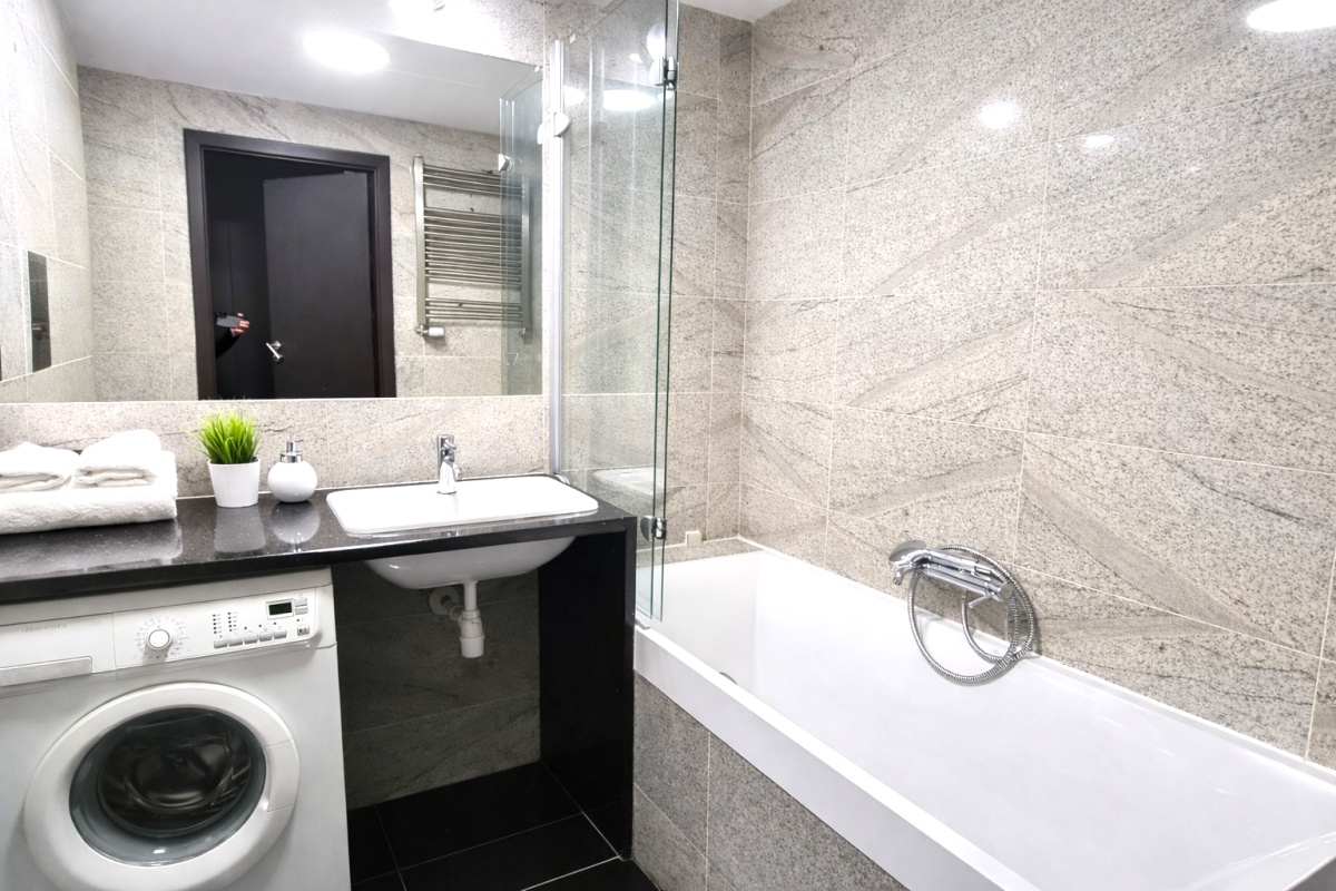 W apartamencie jest pełne wyposażenie: pralka, zmywarka, lodówka, płyta kuchenna, telewizor, duże wygodne łóżko kontynentalne, sofa, stół i krzesła, a na korytarzu duża szafa w zabudowie.