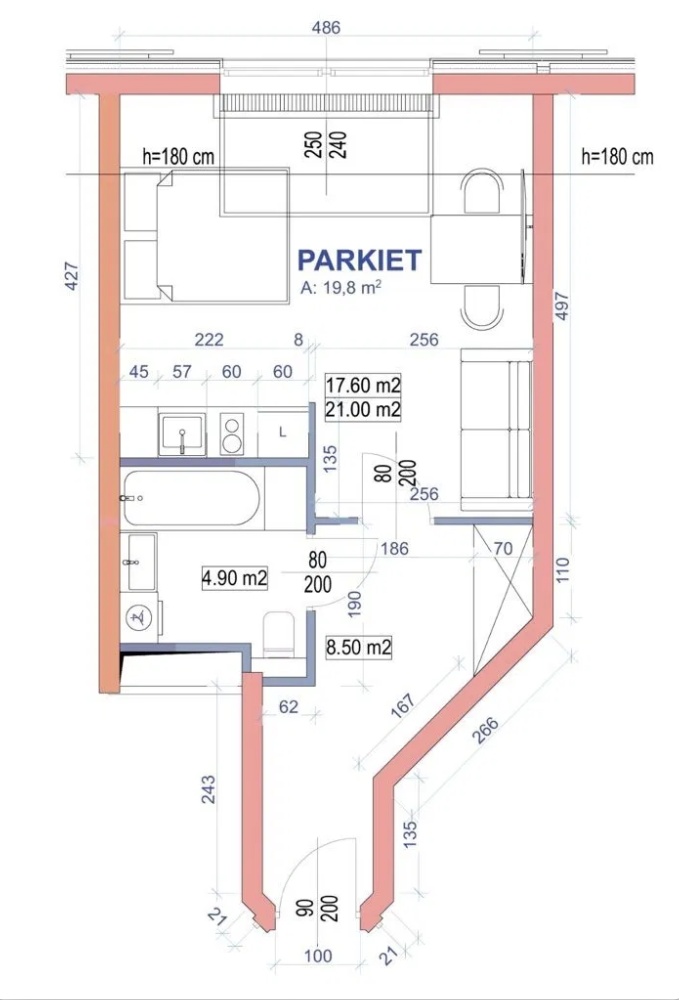 Mieszkanie położone jest na 4 piętrze, ma 31m2 (powierzchni użytkowa, a po powierzchni podłogi 34,4m2). Składa się z: salonu z aneksem kuchennym, łazienki i przestronnego przedpokoju.