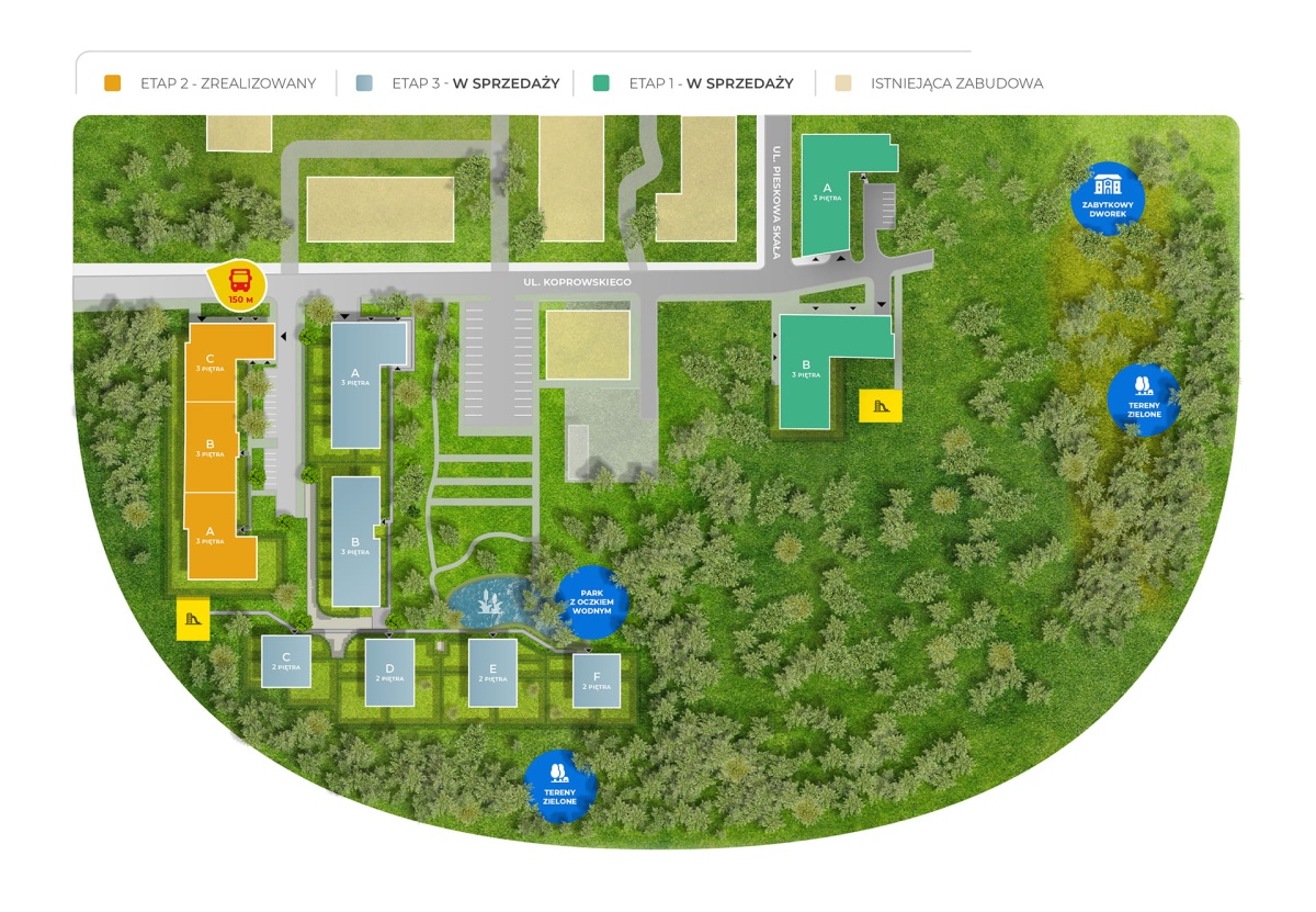 Funkcjonalna kawalerka o powierzchni użytkowej 26,69 mkw., znajdująca się na II piętrze w eleganckim trzypiętrowym apartamentowcu na osiedlu Sady Ursynów w dzielnicy Ursynów na pograniczu z Mokotowem przy ul. Koprowskiego, w rejonie ulic Kłobuckiej i Wyczółki. Budynek charakteryzuje się zgodną z aktualnymi trendami architekturą, wysokim standardem wykończenia części wspólnych oraz nowoczesnymi rozwiązaniami technicznymi (m. in. system Smart Home).