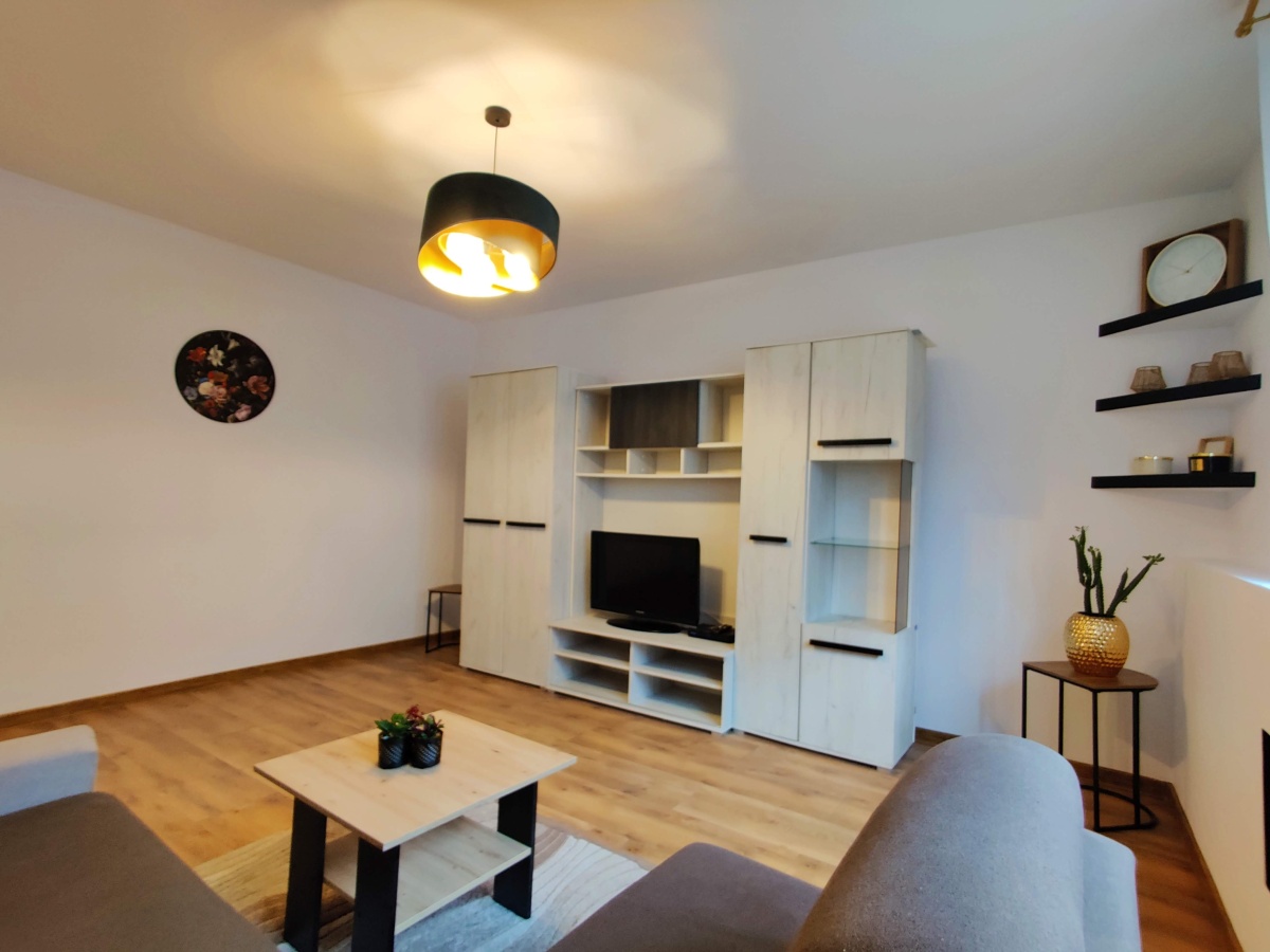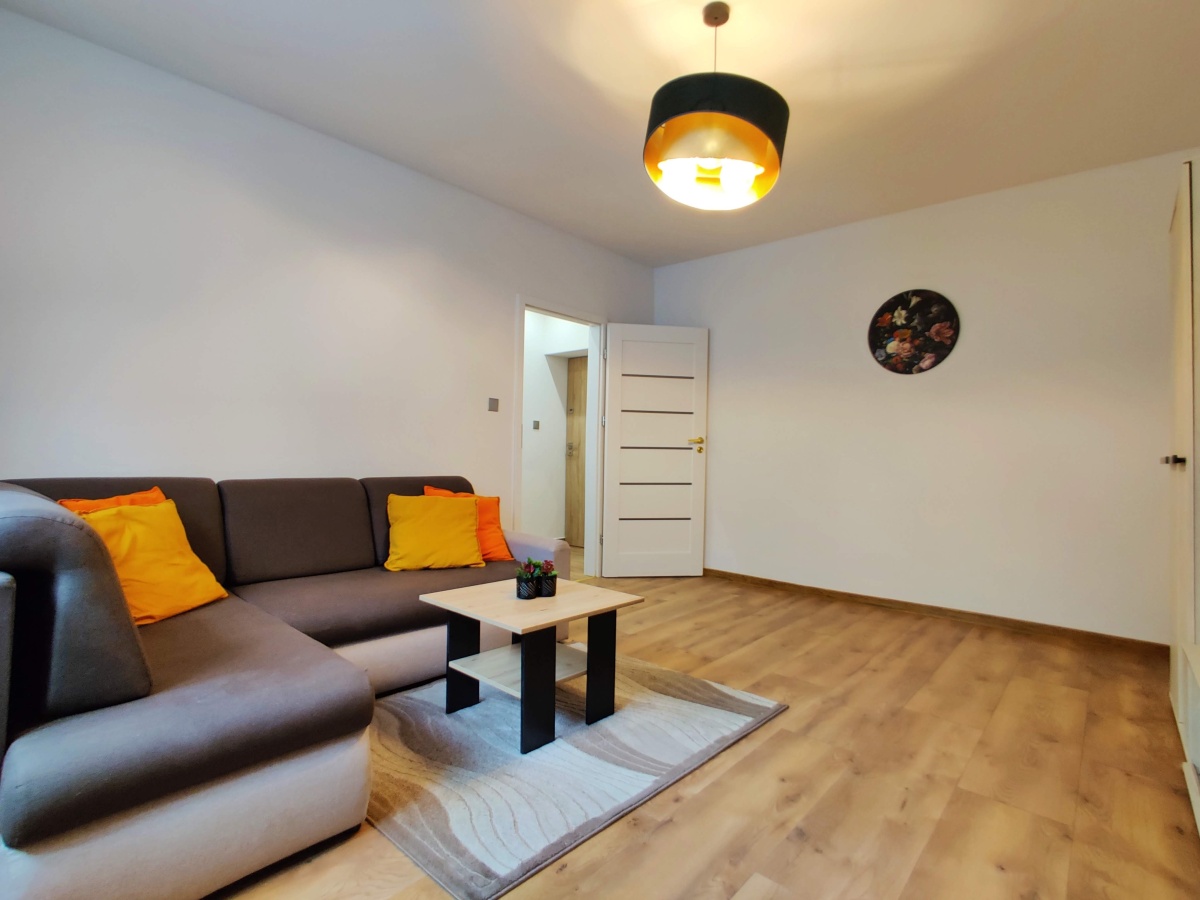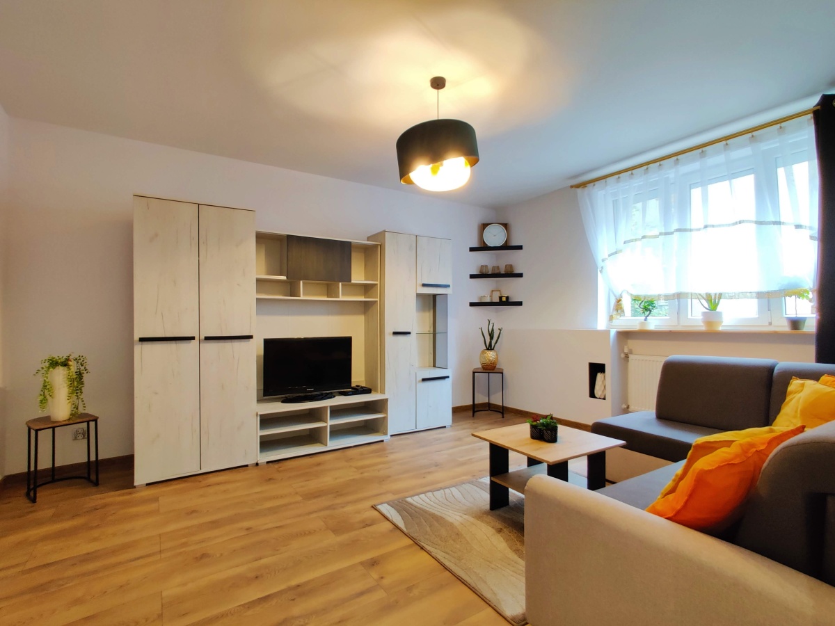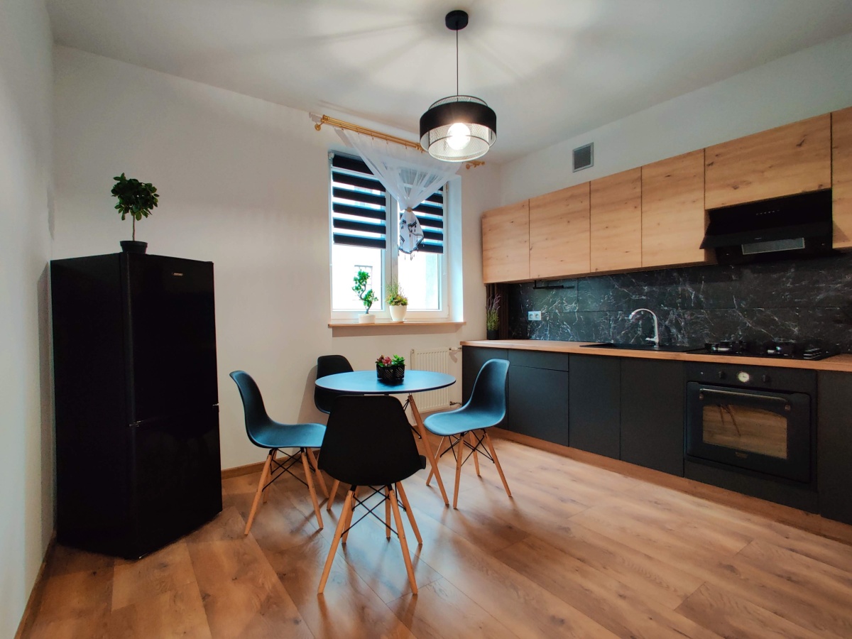 Mieszkanie wyposażone: kompletnie wyposażona Kuchnia: (lodówka, kuchenka gazowa z piekarnikiem, stół z krzesłami, szafki), łazienka: (kabina prysznicowa, pralka, geberit, szafka z umywalką), Pokój: zestaw wypoczynkowy, stolik kawowy, szafa.