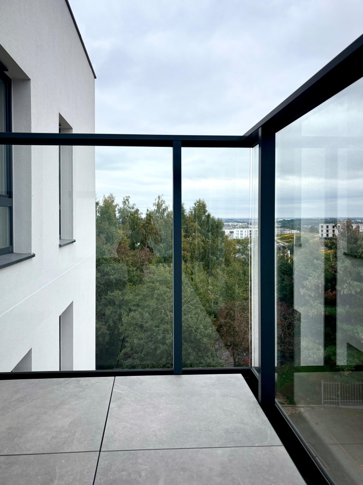 Mieszkanie jest funkcjonalnie podzielone na część dzienną i nocną. Jest jednostronne, z przestronnym balkonem o powierzchni 7,61 m².
