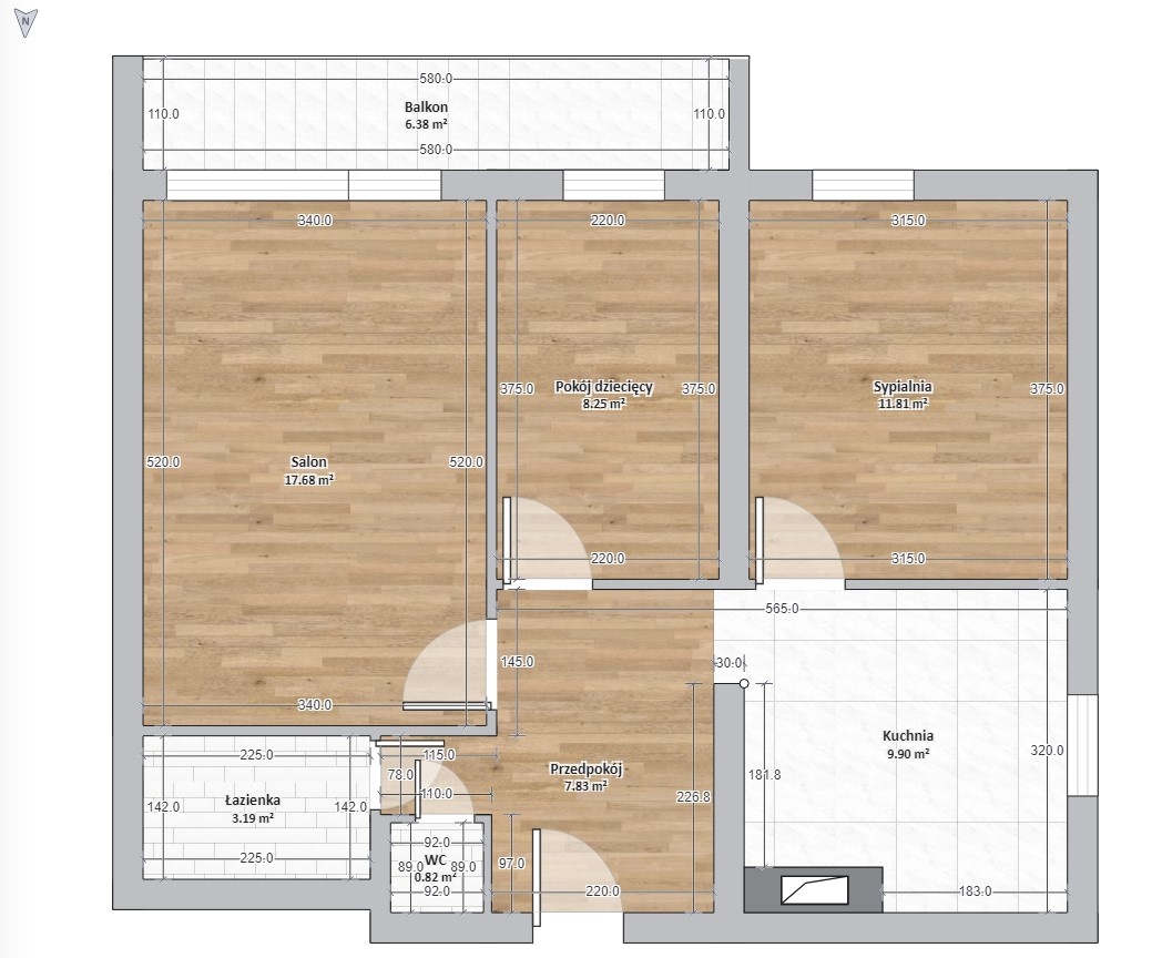 • Podłogi: parkiet w pokojach i przedpokoju, płytki w kuchni oraz łazience.