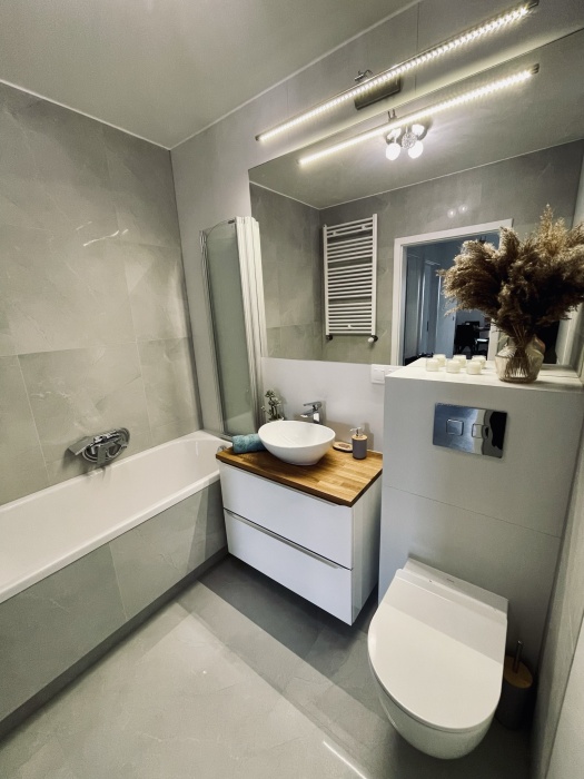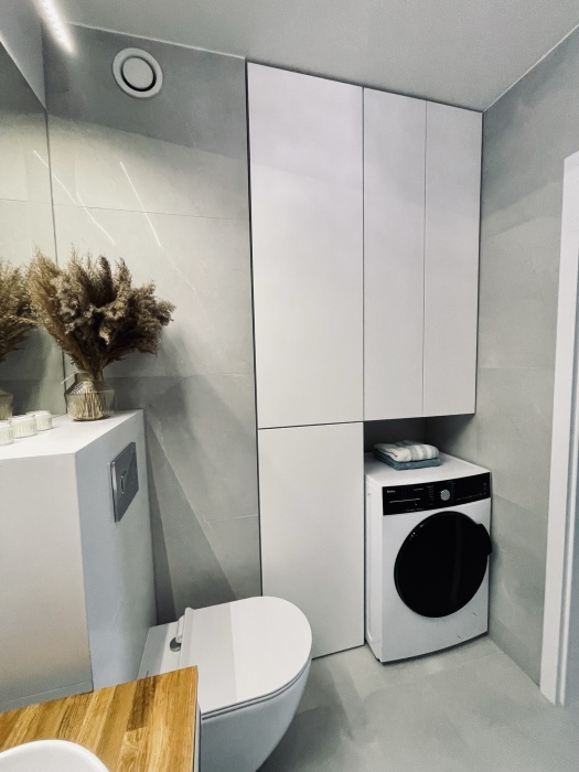 – łazienki (wanna ze szklanym parawanem, WC, umywalka z szafką, pralka, zabudowana szafa),