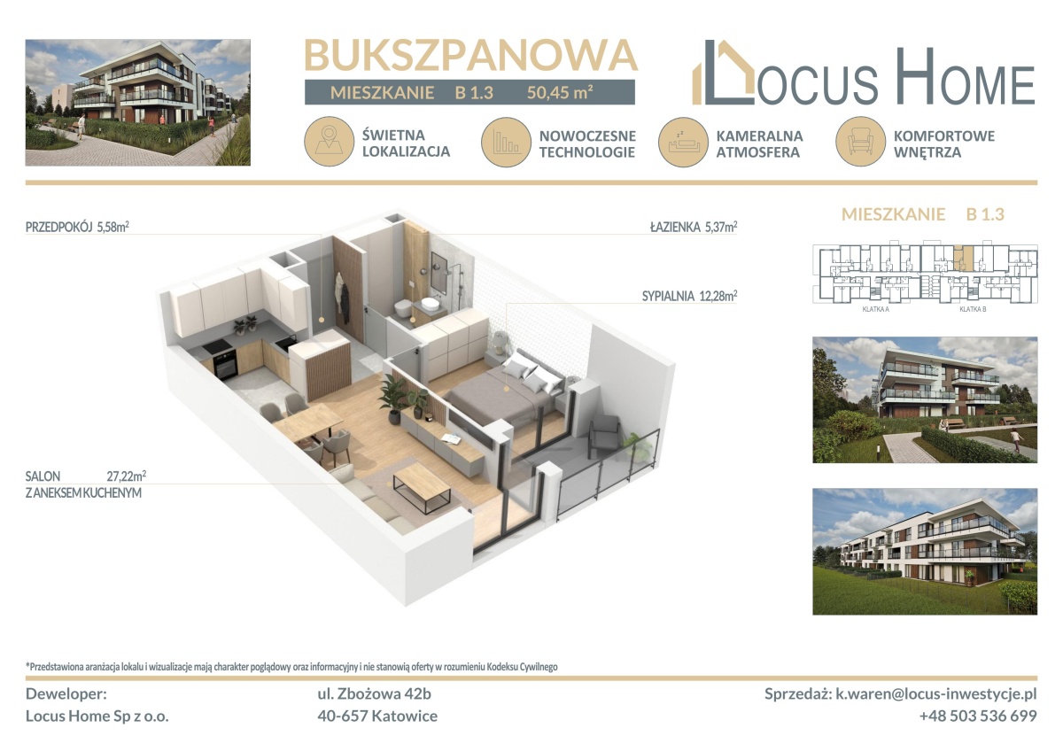 Spółka LOCUS HOME to DEWELOPER który realizuje inwestycje mieszkaniowe na terenie Katowic od wielu lat. NOWA inwestycja na ulicy BUKSZPANOWEJ (obok nr 19) w Piotrowicach to nowoczesny apartamentowiec w doskonałej lokalizacji Katowic.