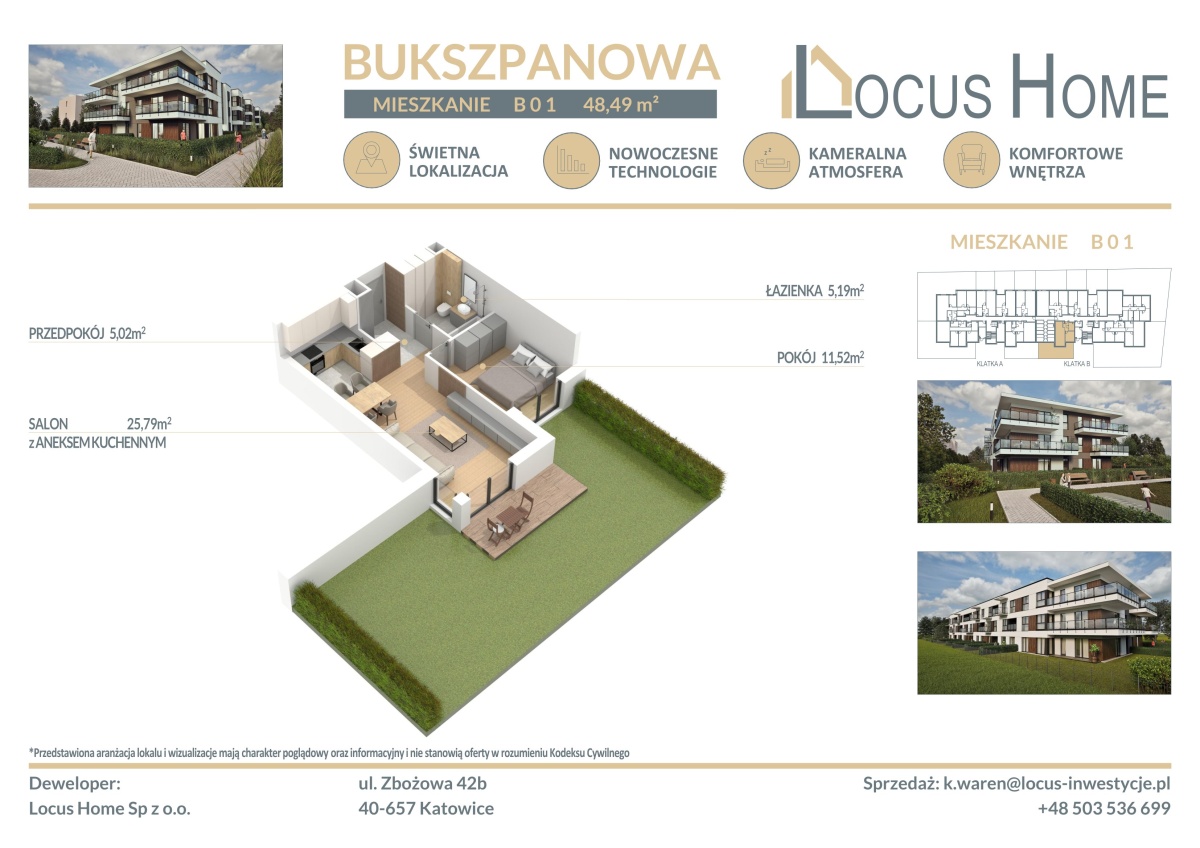 Spółka LOCUS HOME to DEWELOPER który realizuje inwestycje mieszkaniowe na terenie Katowic od wielu lat. NOWA inwestycja na ulicy BUKSZPANOWEJ (obok nr 19) w Piotrowicach to nowoczesny apartamentowiec w doskonałej lokalizacji Katowic.