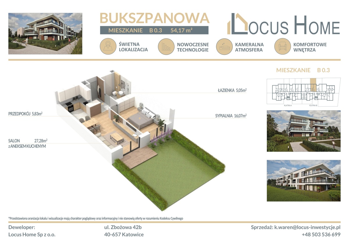 Spółka LOCUS HOME to DEWELOPER który realizuje inwestycje mieszkaniowe na terenie Katowic od wielu lat. NOWA inwestycja na ulicy BUKSZPANOWEJ (obok nr 19) w Piotrowicach to nowoczesny apartamentowiec w doskonałej lokalizacji Katowic.