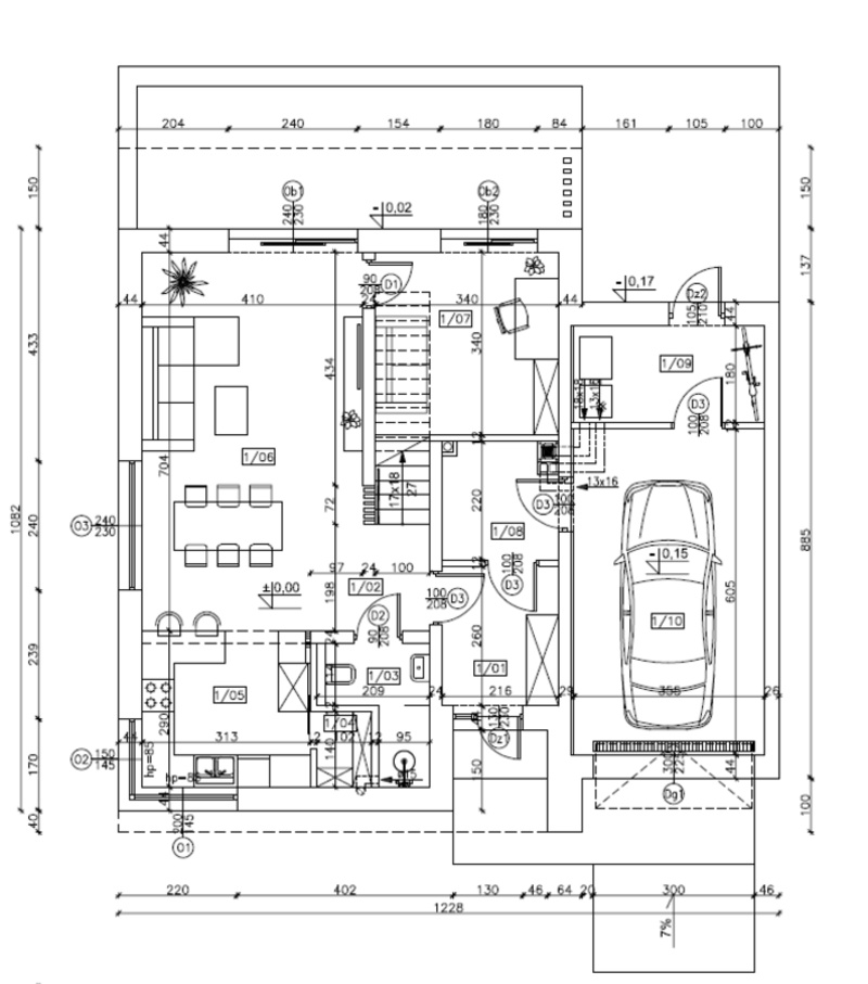 ściany nośne wymurowane z betonu komórkowego h+h gr.24cm. Trzpienie konstrukcyjne, schody oraz strop nad parterem wykonane w technologii żelbetowej monolitycznej z betonu C20/25. Ocieplenie ścian zewnętrznych to 20cm styropian grafitowy (lambda 0,31W/mK) + elewacja zewnętrzna wykonana produktami marki Mapei.