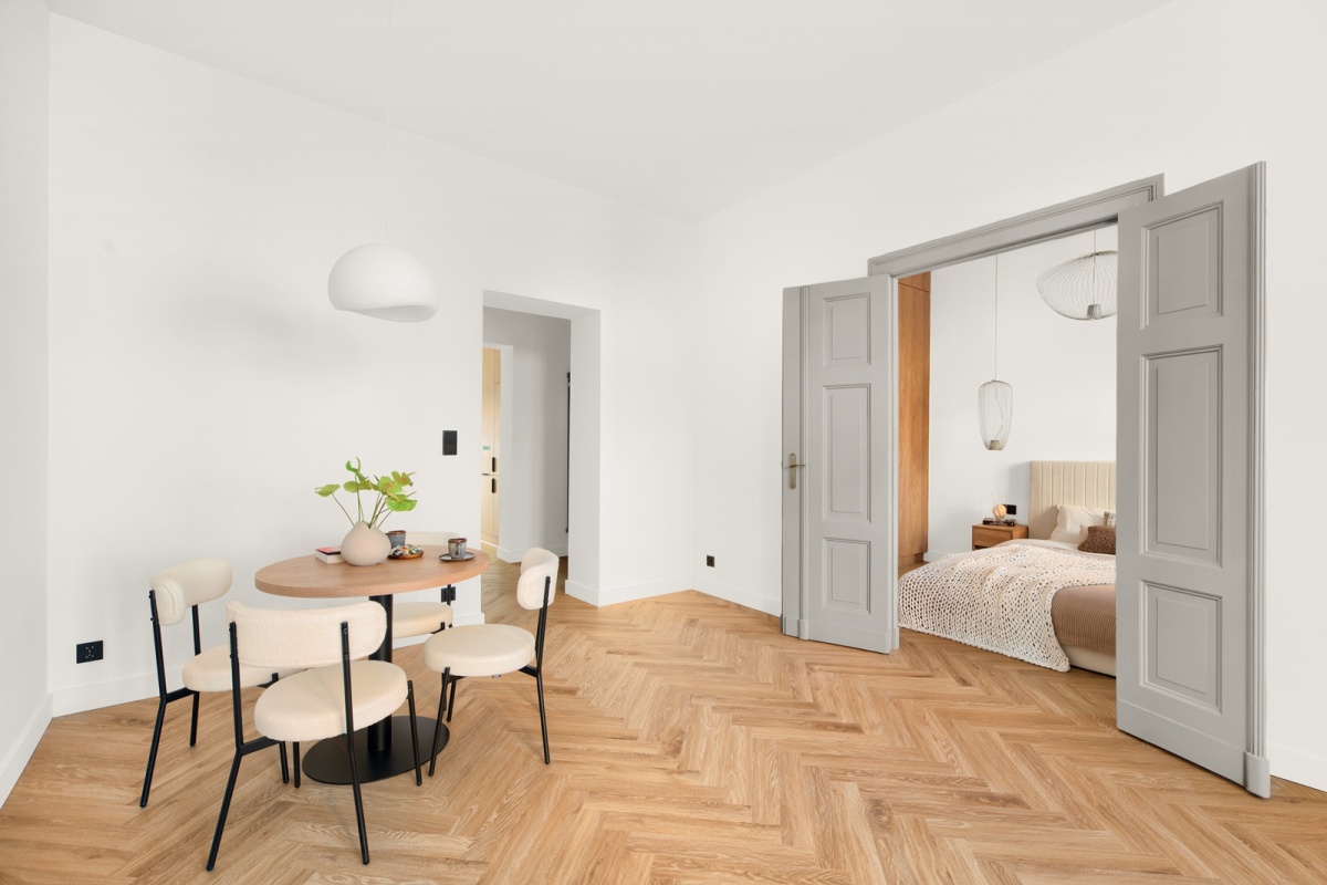 – przestronna sypialnia, do której prowadzą odrestaurowane, kamieniczne dwuskrzydłowe drzwi w kolorze szarym,