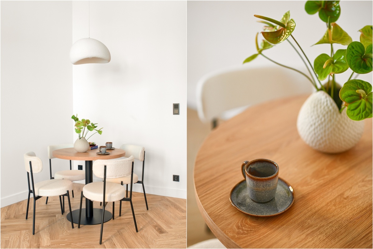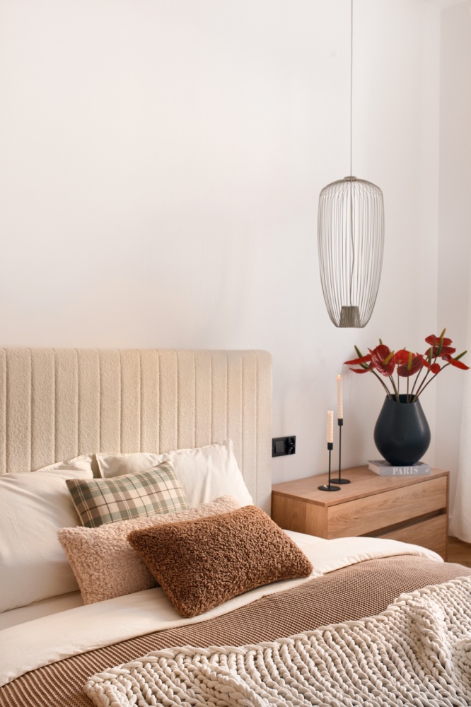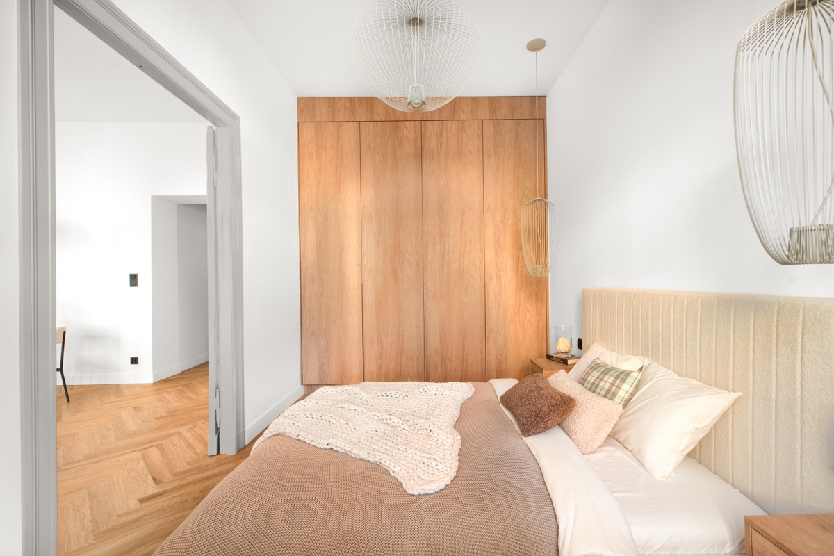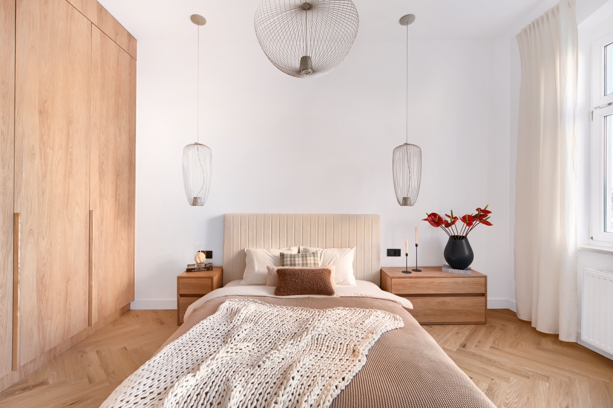 – na wyposażeniu boucle’owe łóżko oraz pojemne stoliki nocne wykonane na zamówienie,