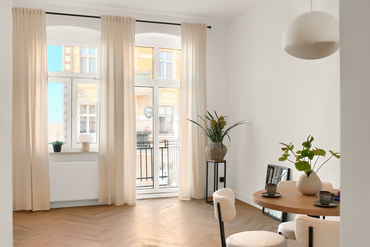 – w oknach kremowe zasłony.