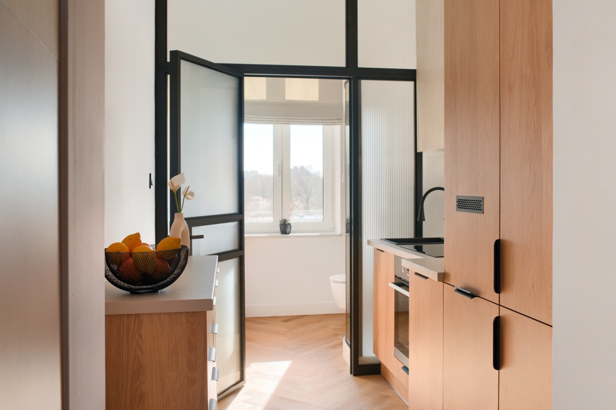 – do łazienki prowadzą drzwi osadzone na metalowo-szklanej ścianie wykonanej według naszego indywidualnego projektu na zamówienie. Szkło matowe, dwuwarstwowe, ryflowane,