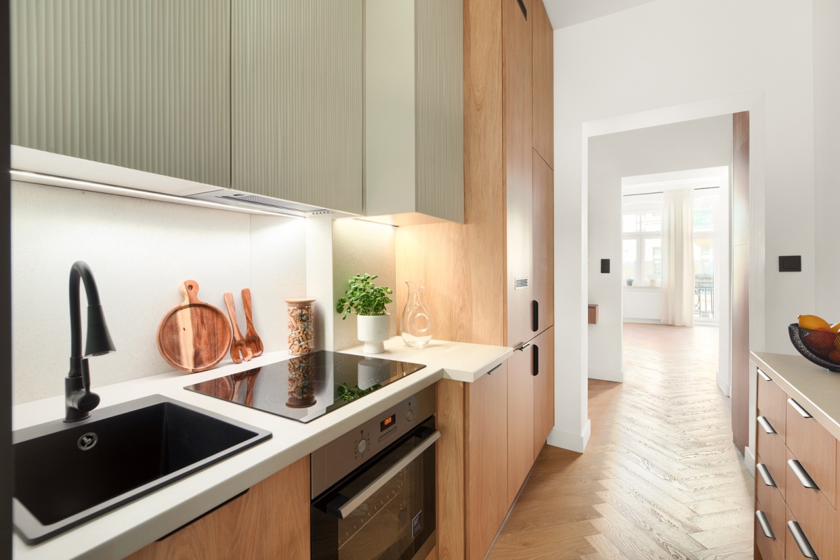 – wyposażenie : zlewozmywak, płyta indukcyjna, zmywarka, lodówka z zamrażarką, piekarnik, pochłaniacz powietrza,