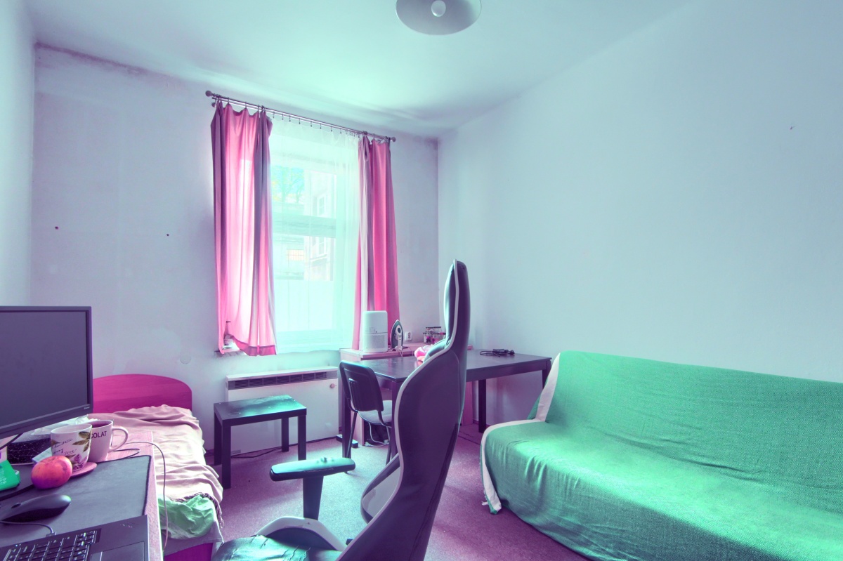 Pokoje umeblowane pod najemców: łóżka, szafy, biurka. W kuchni meble kuchenne, lodówka, kuchenka elektryczna czteropłytowa. W łazience pralka, wanna.