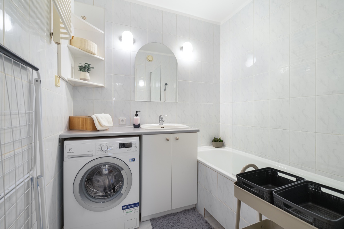 • Dodatkowo w mieszkaniu znajdują się pralka, lodówka, czajnik, kuchenka gazowa, kuchenka mikrofalowa, odkurzacz, deska do prasowania, suszarki na bieliznę, ekspres do kawy