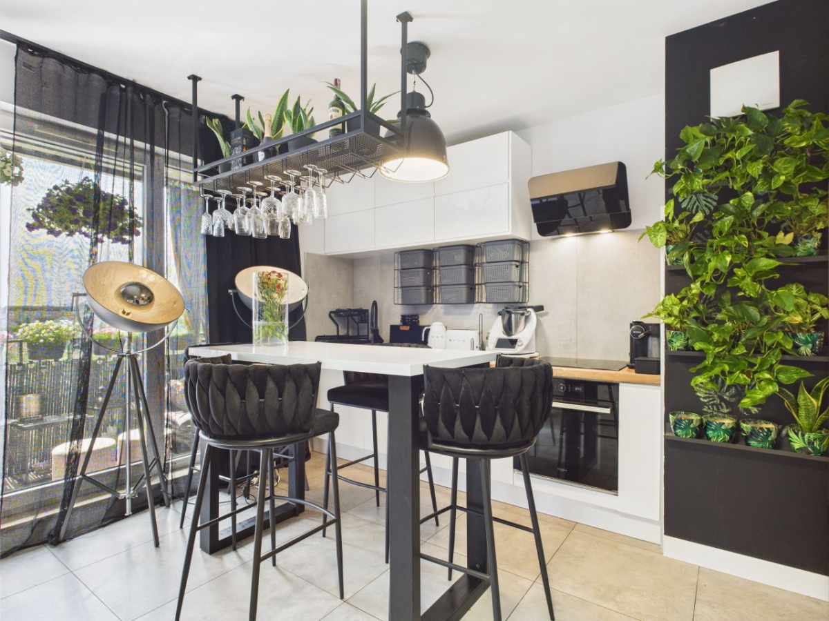 Salon z aneksem kuchennym (21,77 m²) – serce mieszkania, idealne miejsce na wspólne posiłki, rozmowy i relaks. Wyjście na przestronny balkon (8,96 m²) daje możliwość odpoczynku na świeżym powietrzu.