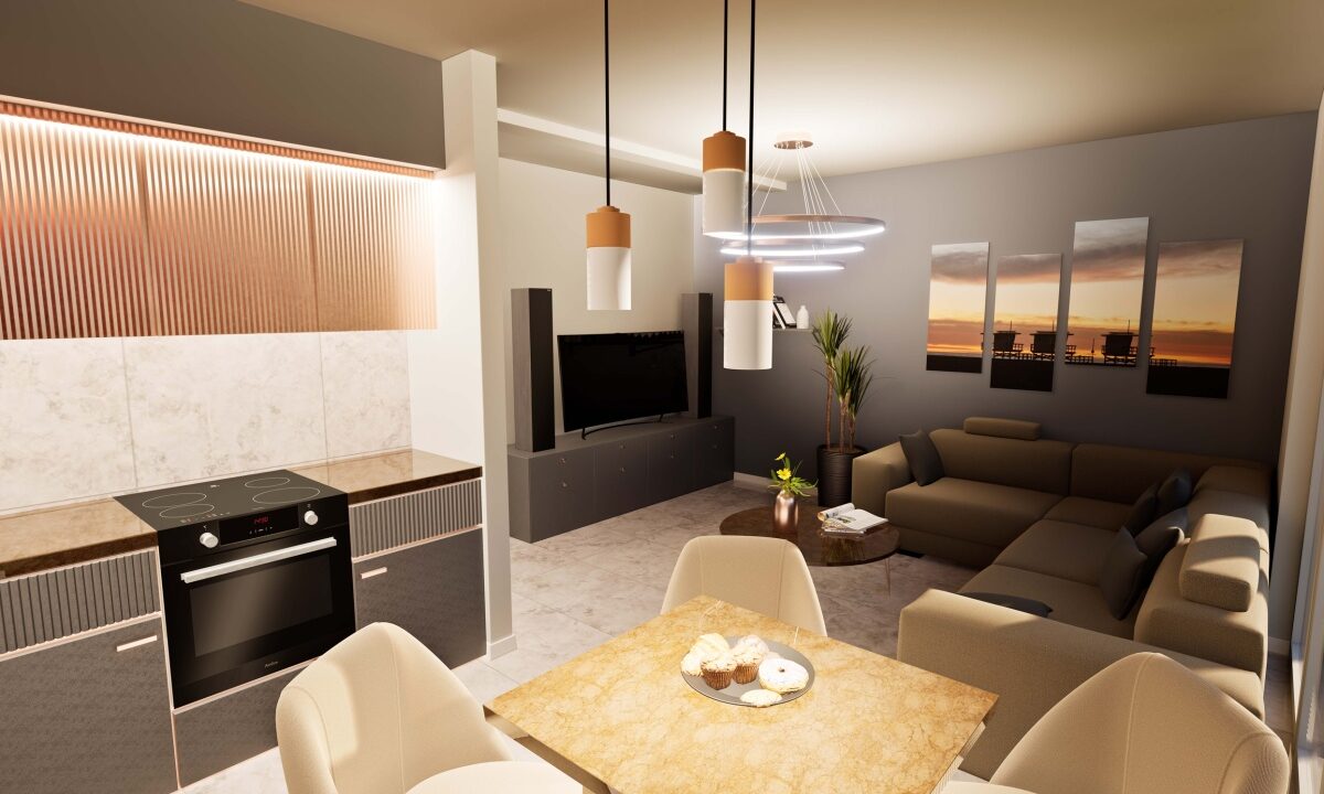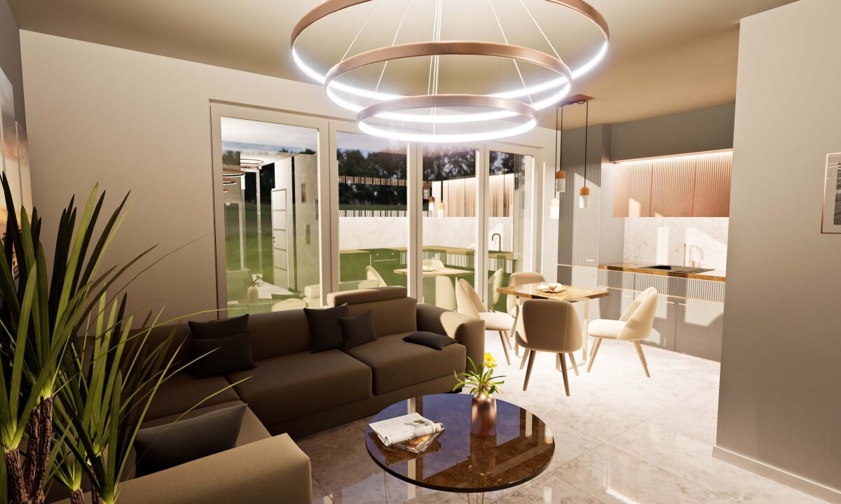 Przestronny salon z otwartą kuchnią i przeszkloną ścianą z widokiem na swój ogród, dające poczucie przestrzeni,