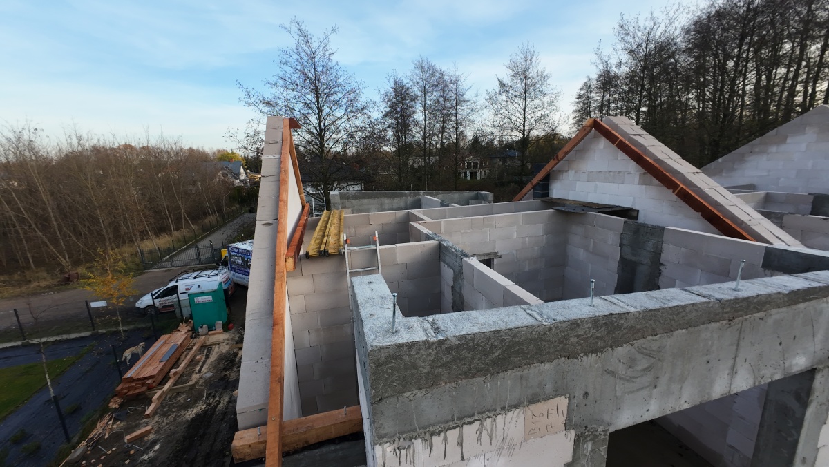 Nowoczesna elewacja z elementami drewnopodobnymi i blachą na rąbek nadaje inwestycji elegancki, ponadczasowy charakter.
