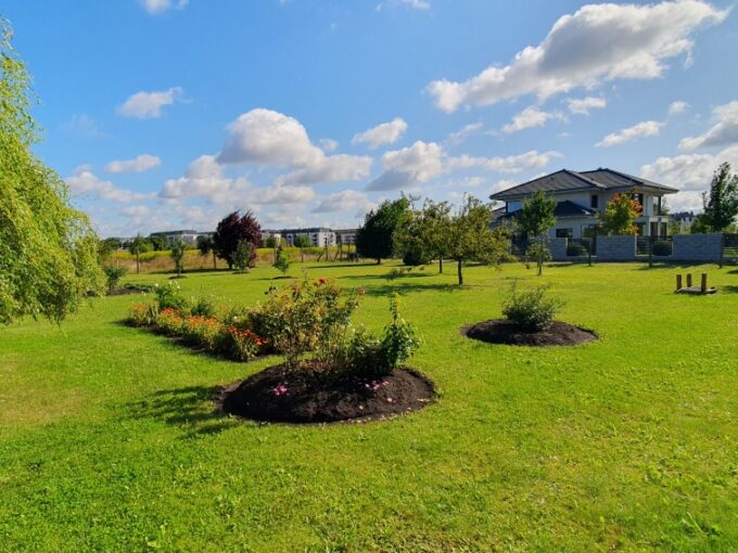 Działka ogrodzona (front: metaloplastyka, reszta: siatka), liczne nasadzenia
