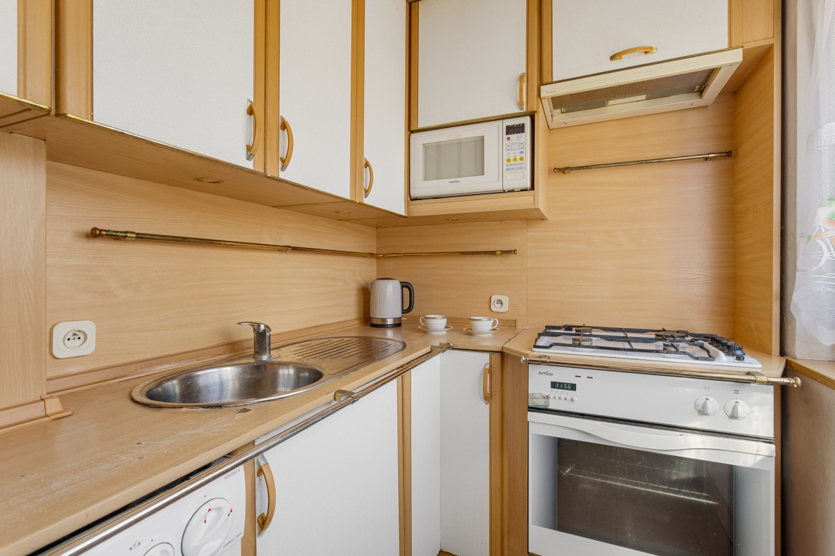 Kuchnia jasna, funkcjonalna i w zabudowie.